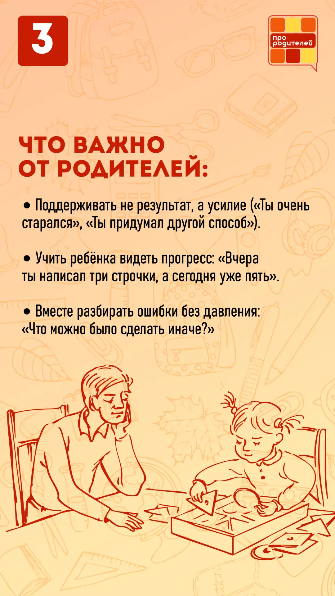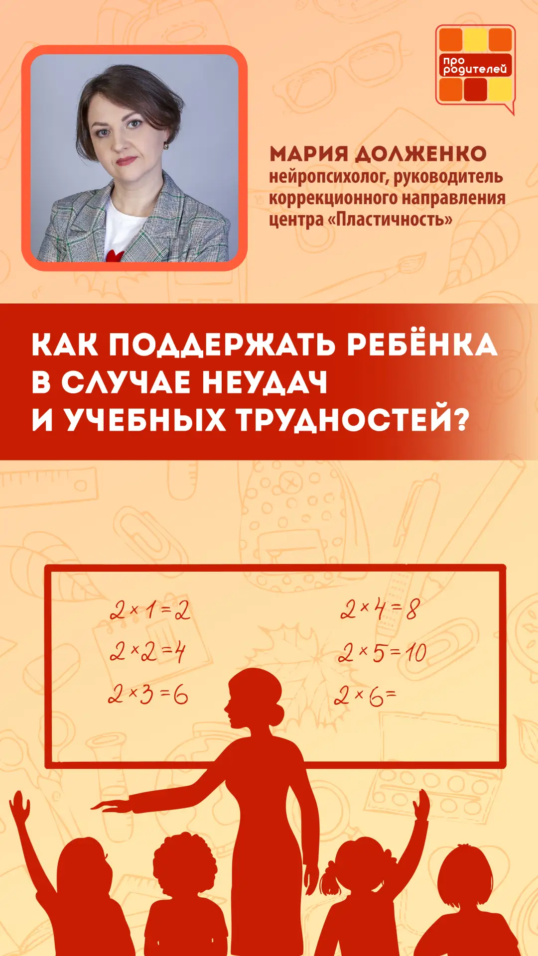 ⭕️ Наш эксперт Мария Долженко, (https://t.me/mariadolzhenkoneuro) нейропсихолог и руководитель коррекционного направления центра «Пластичность», (https://t.me/neuropsy_centr) дала рекомендации, как родителям поддерживать ребенка в моменты его неудач и учебных трудностей.