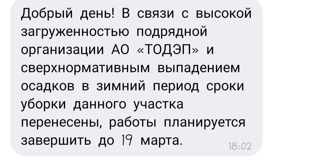 Здравствуйте. По адресу Энергостроителей 11, УК «На Полевой» не чистит снег на крыше, который уже во всю падает. В чате дома представители УК писали, что сделают это в ближайшее время, но этого так и не произошло. Видимо ждут пока кто-то уедет в трампункт.