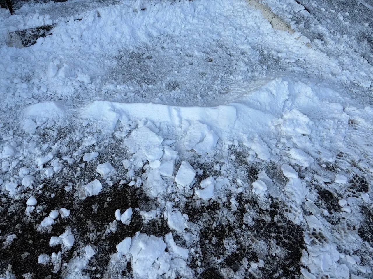 ещё небольшой участок по этой же прямой между дорожкой, которую спокойно чистят, и въездом на парковку соседнего дома. и на этом участке образовалась глубокая калея от курьеров на скутерах. на 2 фото её видно, хотя и не так отчëтливо из-за свежего снега