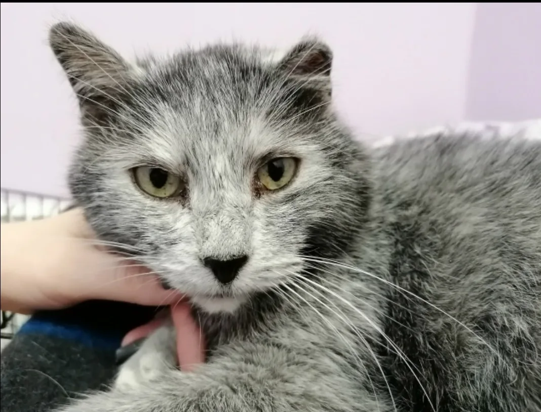 Котика выбросили хозяева и целые пол-года он скитался по улице худой и больной, пока не прибился к прайду бездомных котиков, а потом попал в приют.