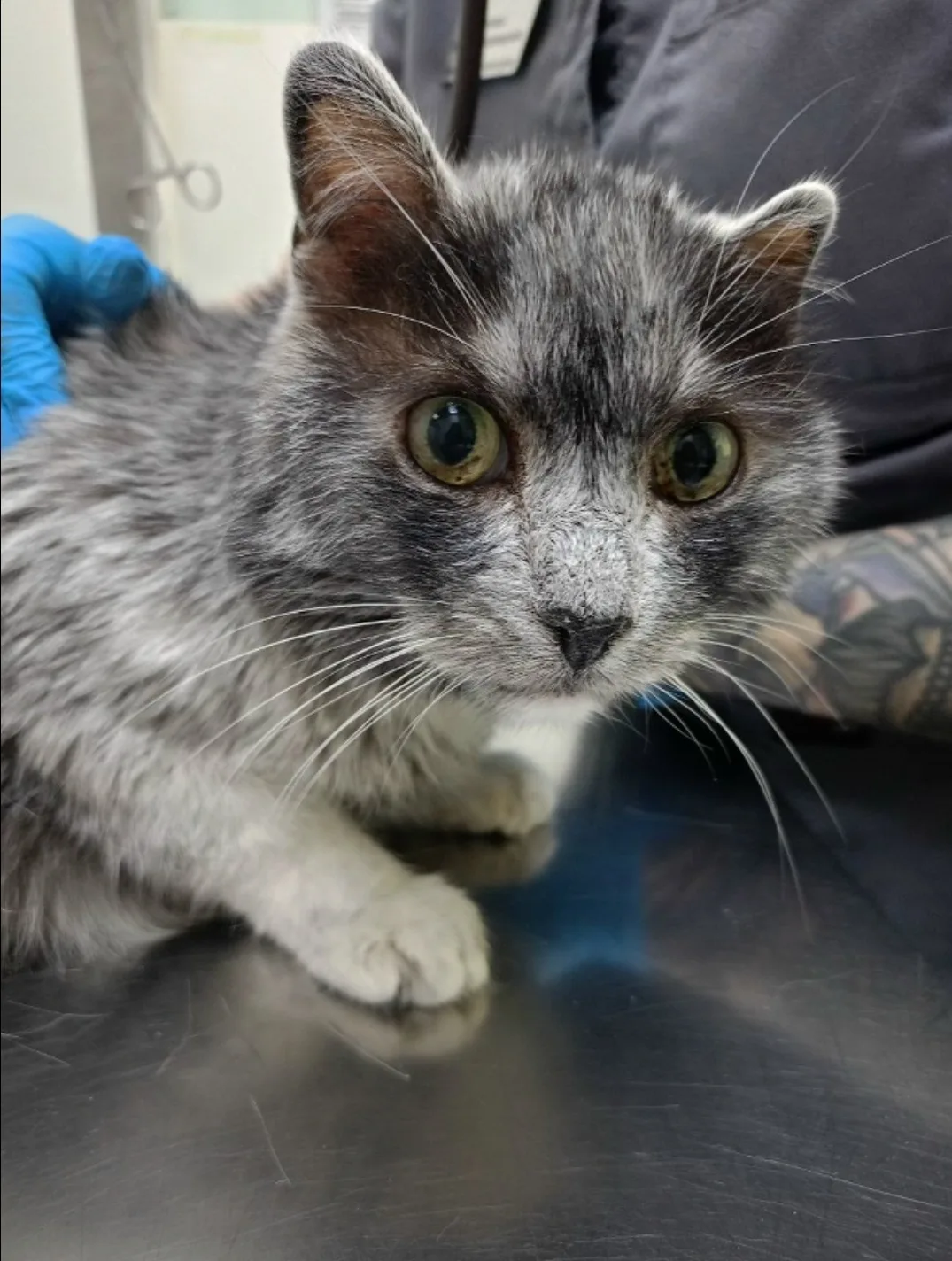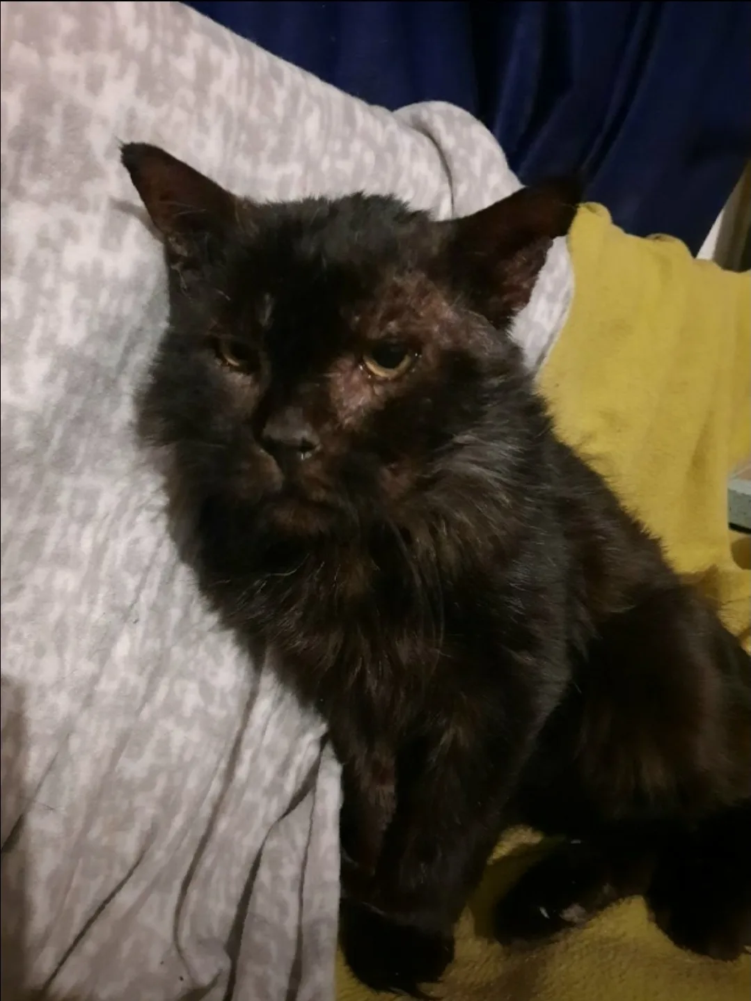 Котик остался без дома, пережил морозную зиму, спал на снегу. Как он выживал на улице - загадка. Возможно, ночевал в машинах, так бы очень грязный, весь покрыт каким-то мазутом.