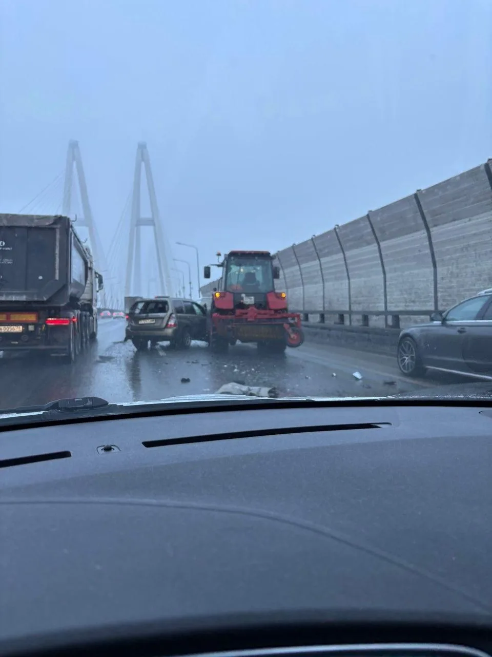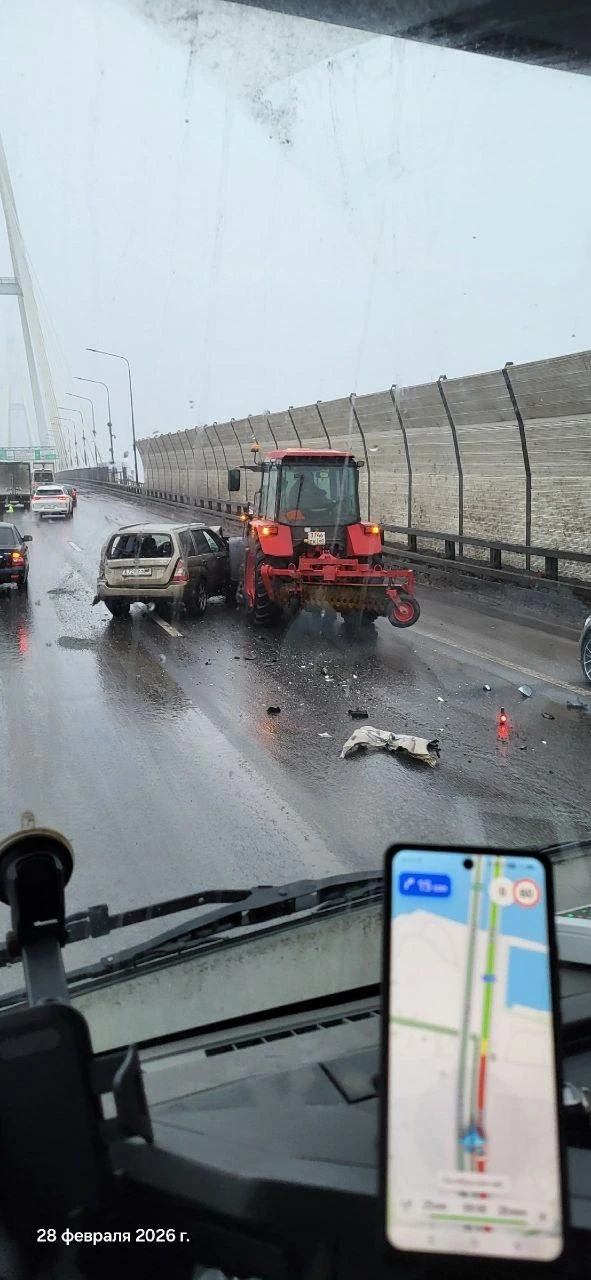 На внутреннем кольце КАД перед заездом на Вантовый мост столкнулись трактор и легковой автомобиль. Из-за аварии движение на участке оказалось затруднено.