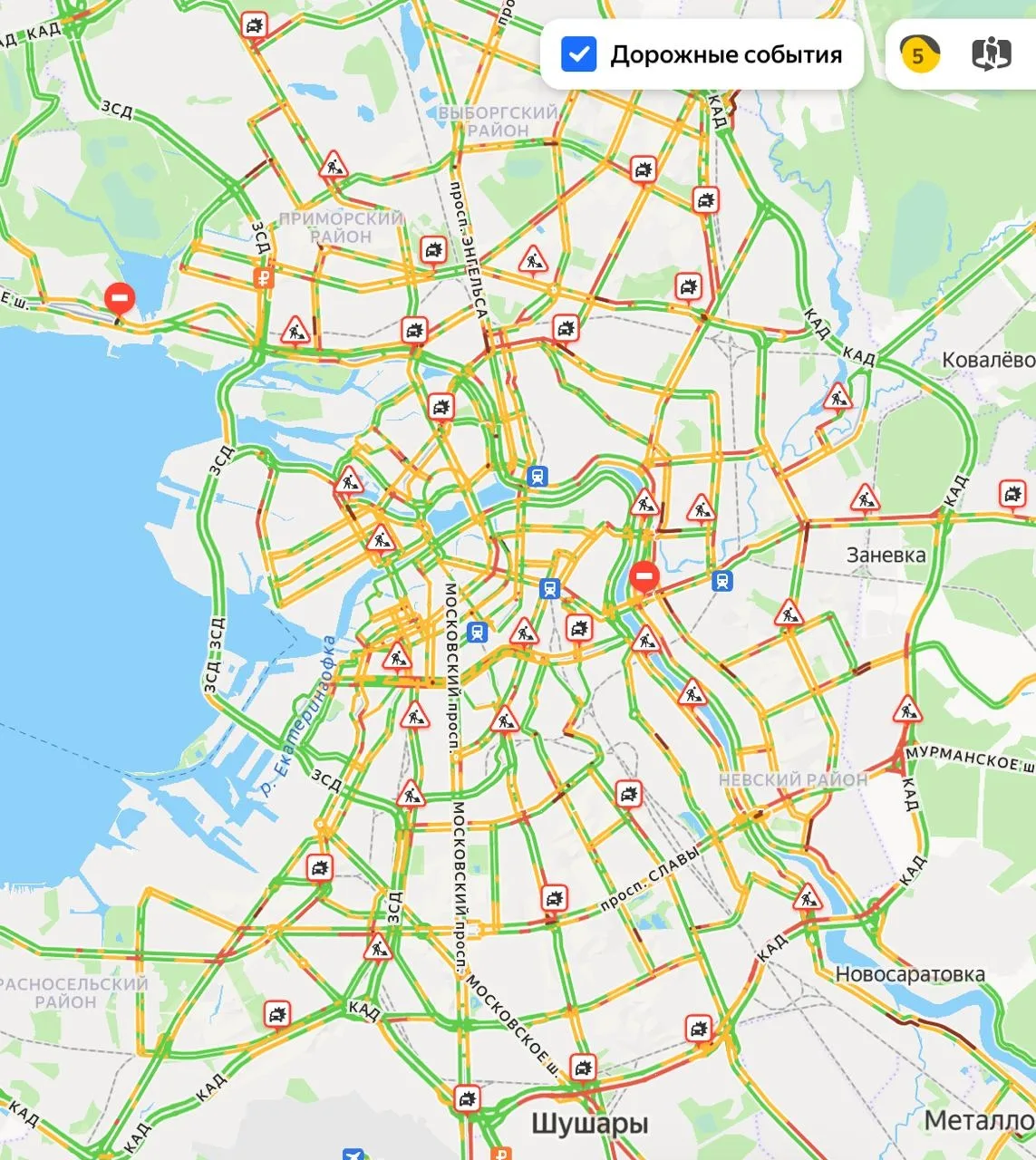 Самые загруженные участки — Московское шоссе, набережная Черной речки, Советский и Заневский проспекты.
