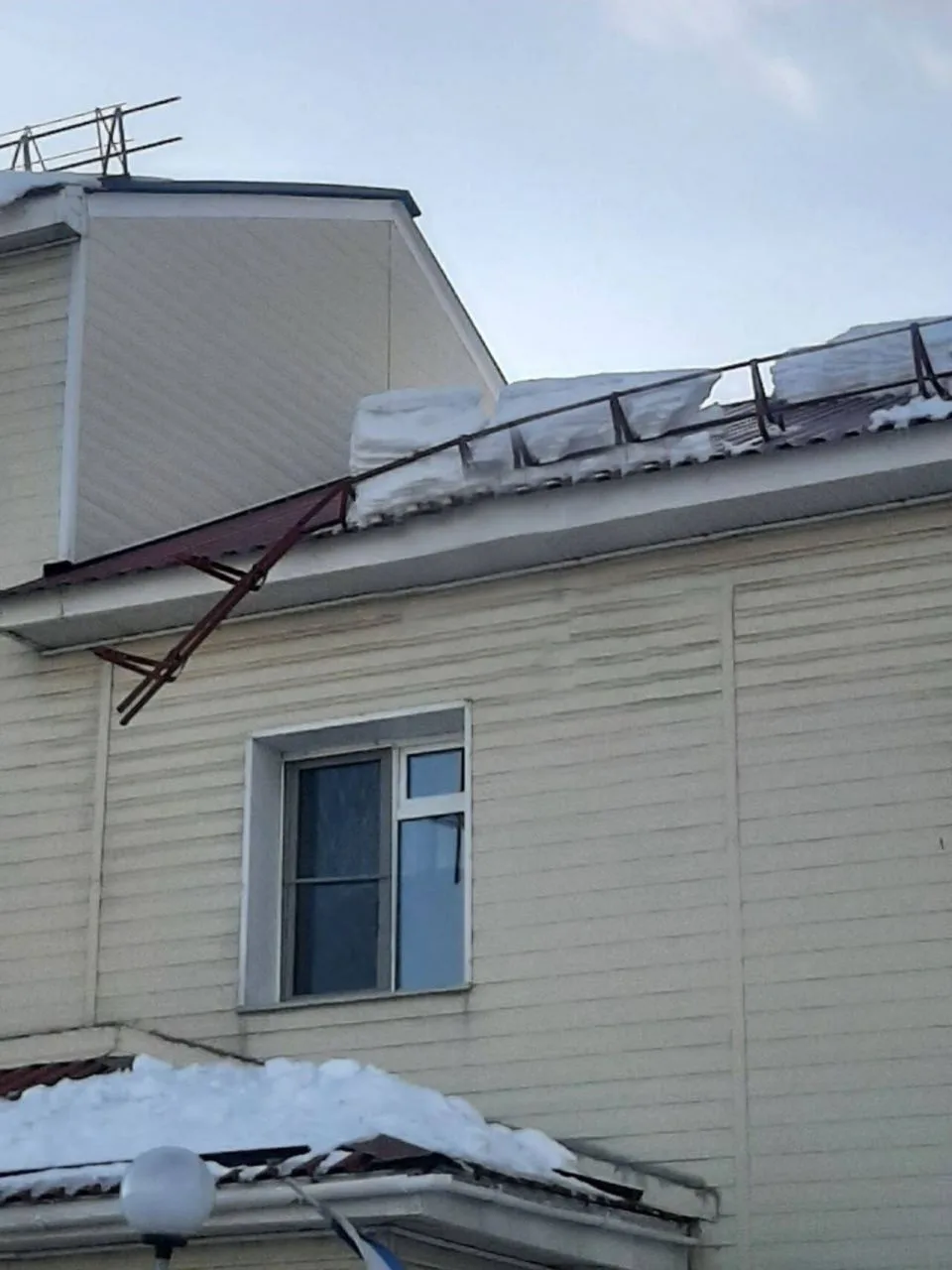На крыше детсада уже больше недели находятся снег и снегодержатель, которые в любой момент могут упасть кому-нибудь на голову.