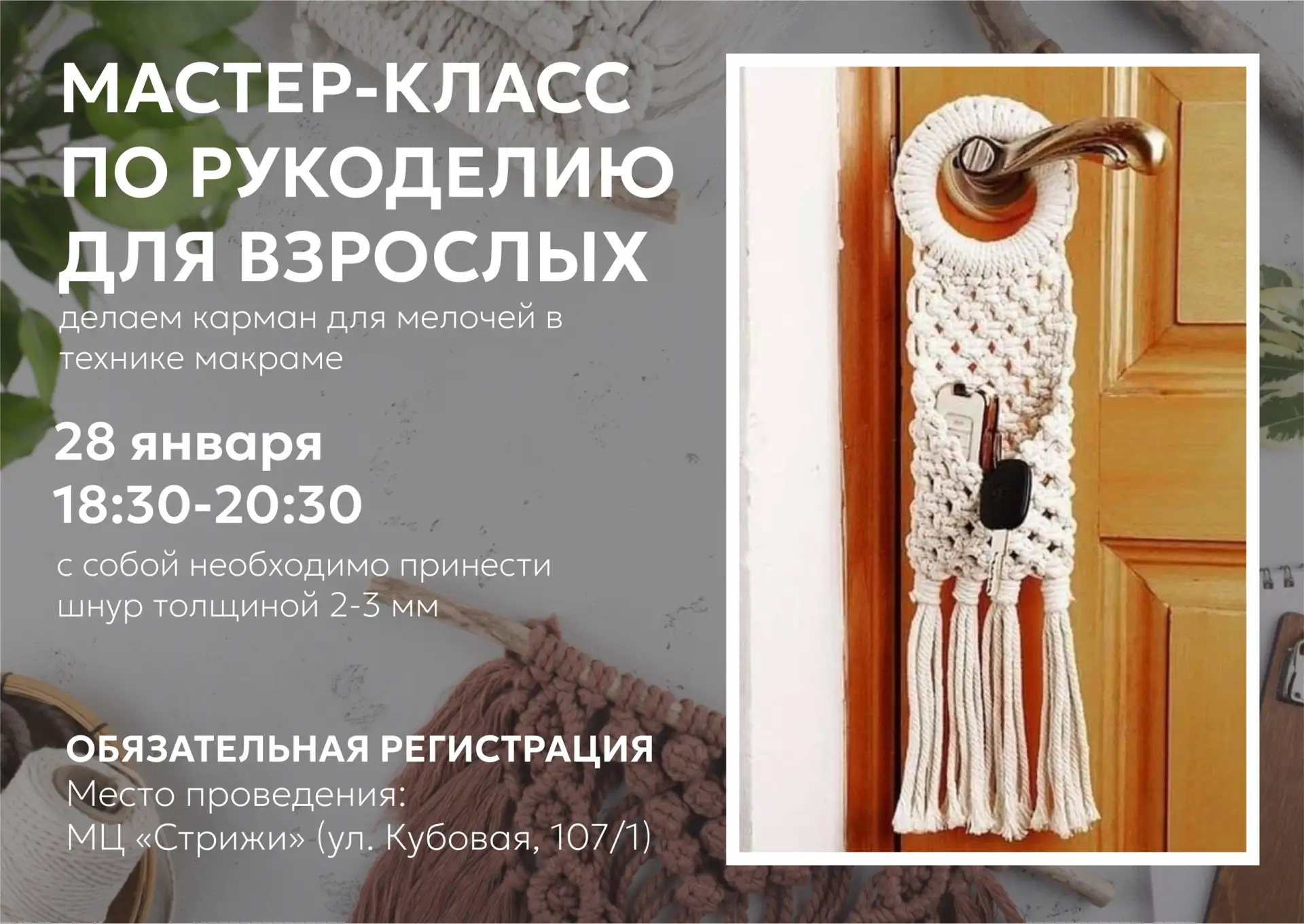 В среду 28 января ждем вас в гости, чтобы создать своими руками кармашек для мелочей в технике макраме. Для данного мастер-класса нужно принести с собой шнур толщиной 2-3 мм!