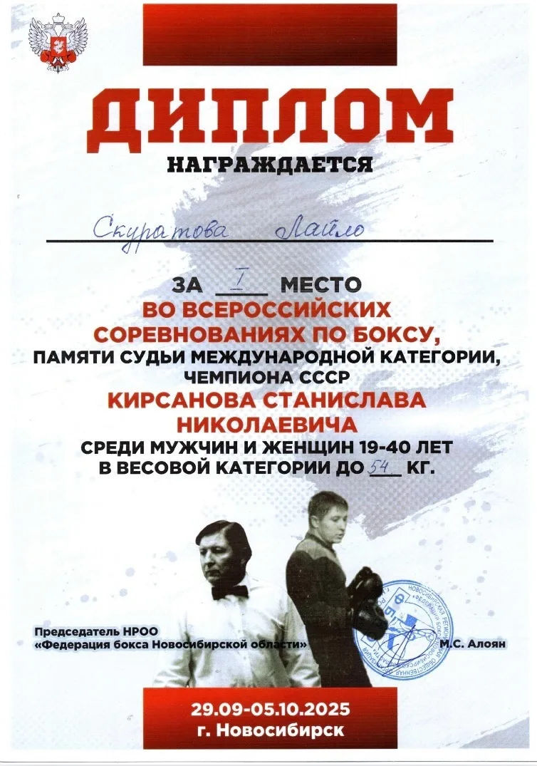 🥇Воспитанница Лыкова Дмитрия Николаевича Скуратова Лайло на завоевала золотую медаль в категории до 54 кг на Всероссийских соревнованиях по боксу памяти судьи международной категории, чемпиона СССР Кирсанова Станислава Николаевича.