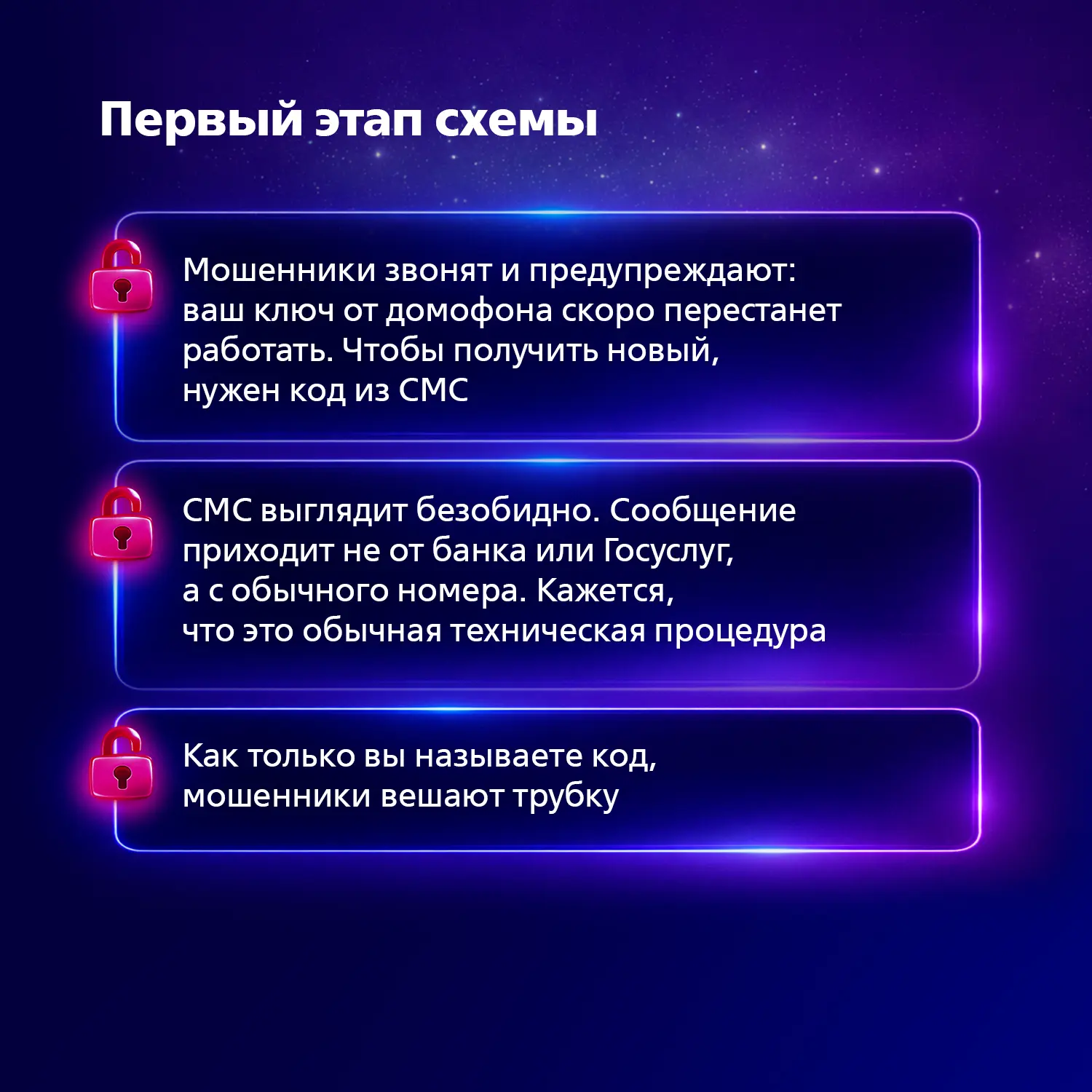 Мошенники придумали новую легенду — звонят от имени домофонной компании и говорят, что старые ключи скоро перестанут работать. А дальше просят скачать «обновление» (вирус) на телефон или оставить заявку на выдачу новых ключей, чтобы получить данные карты.