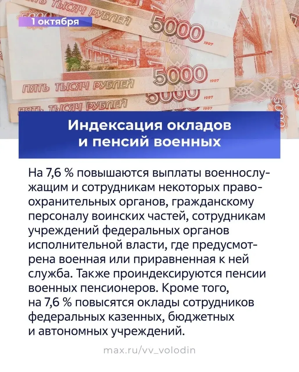 📌 На 7,6% проиндексируют оклады военнослужащих и сотрудников некоторых правоохранительных органов. Повысятся пенсии военных пенсионеров.