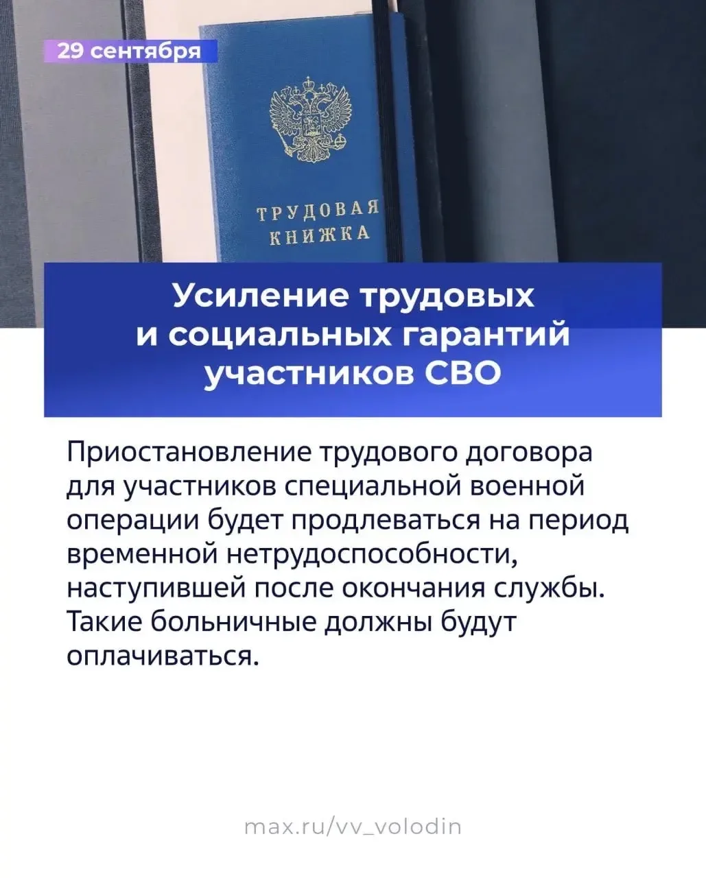 📍 усиливается защита трудовых прав военнослужащих — после окончания службы они смогут взять необходимое время для восстановления без риска потерять рабочее место (вступил в силу 29 сентября);