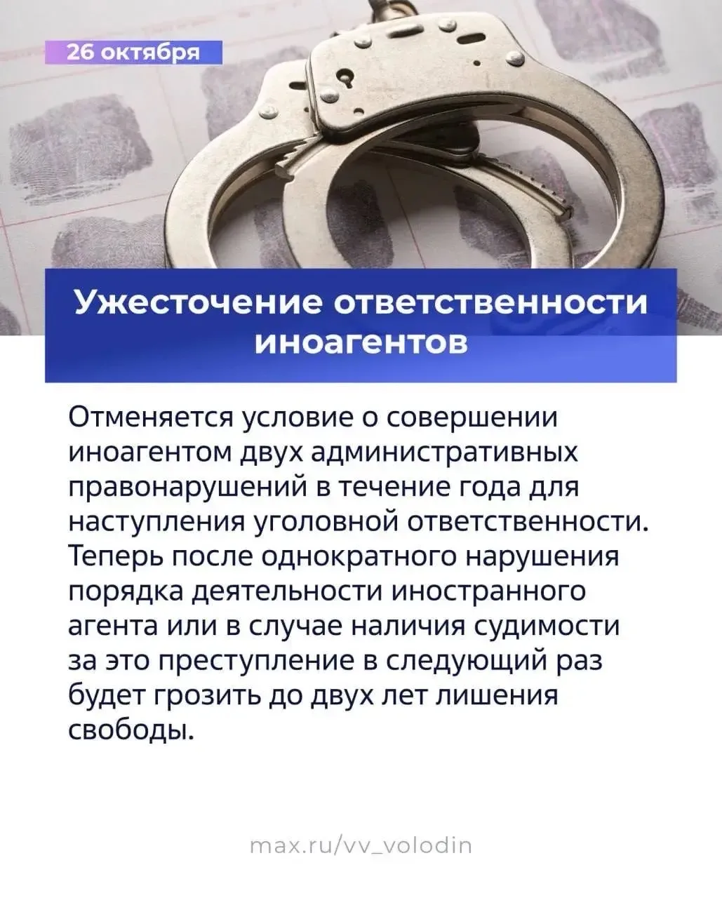 Теперь иностранному агенту будет грозить до 2 лет лишения свободы в случае, если ранее им уже был нарушен порядок деятельности иноагента или имеется судимость за это преступление (вступил в силу 26 октября).