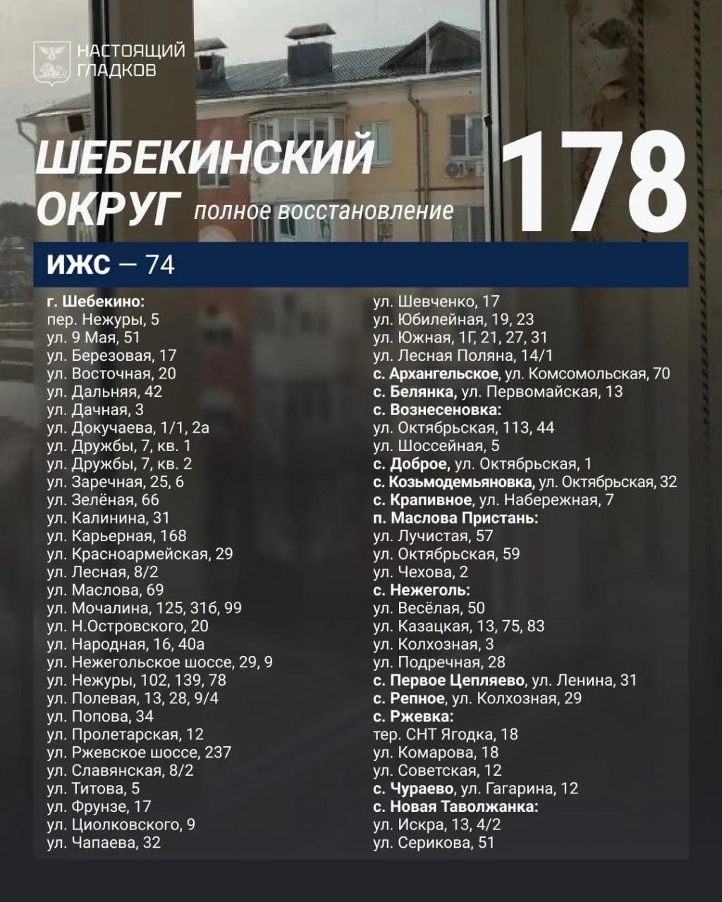 Размещаю список адресов, на которых, по докладу глав округов, выполнены работы по восстановлению жилья.