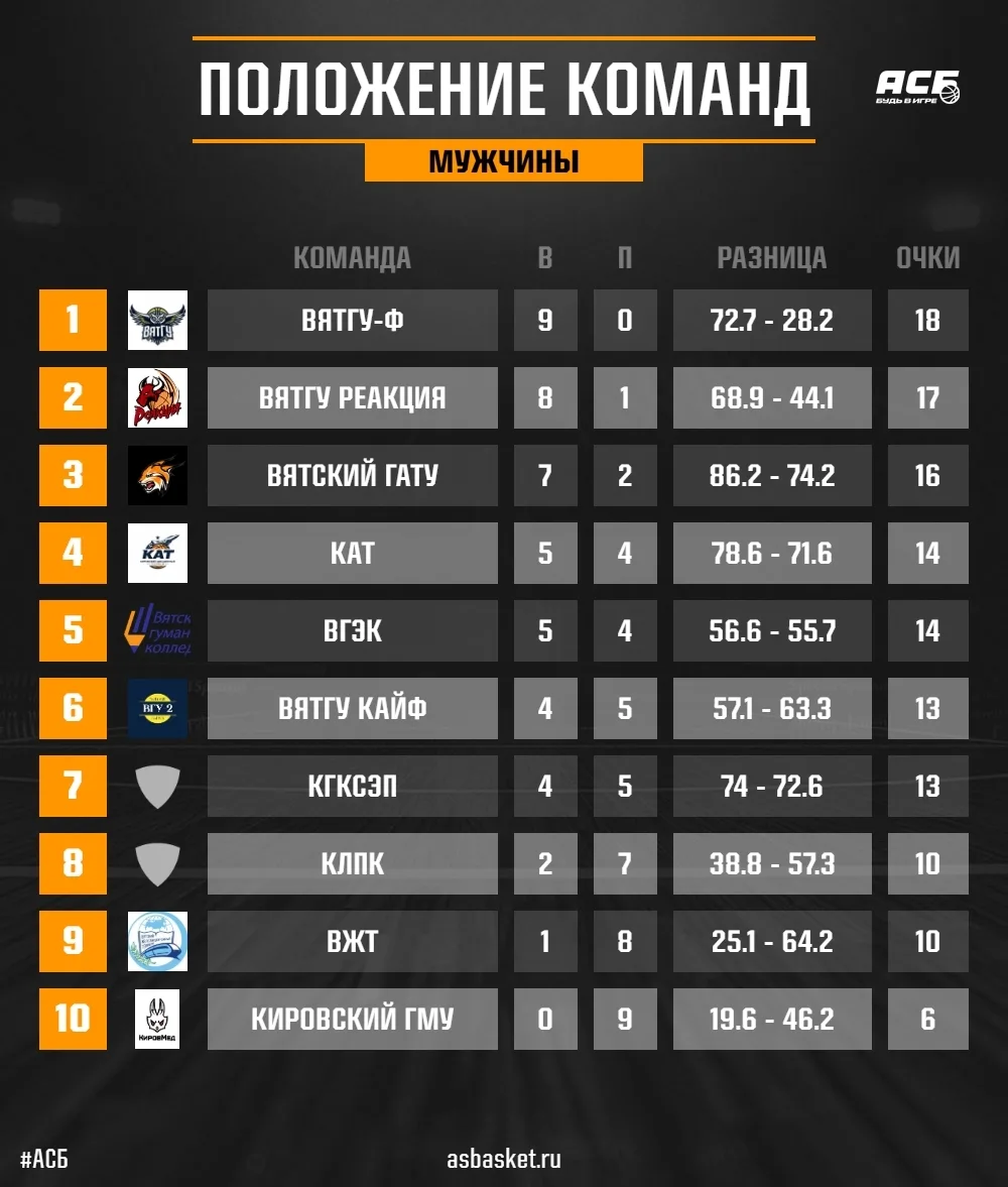 За звание сильнейших боролись сборные четырёх крупнейших вузов города: ВятГУ, КГМУ, МГЮА и Вятский ГАТУ.