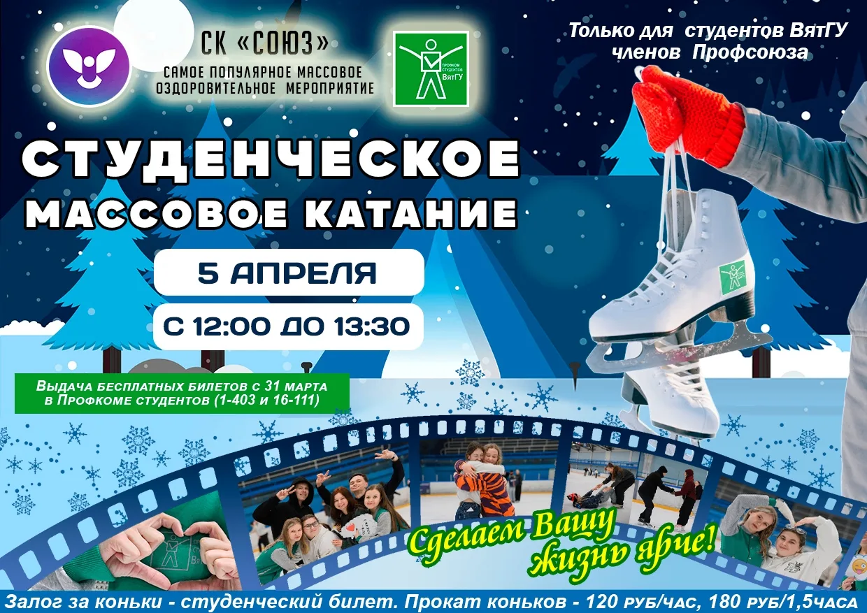 Поэтому мы не отменяем, а ПРИГЛАШАЕМ на СТУДЕНЧЕСКОЕ МАССОВОЕ КАТАНИЕ В СК «СОЮЗ» от Профкома студентов ВятГУ!