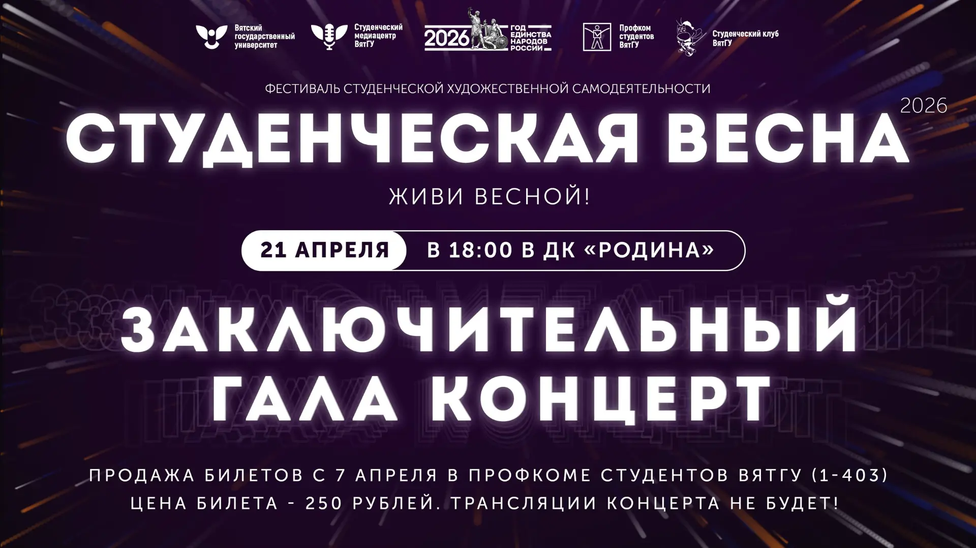 🎟 Билеты на гала-концерт можно найти в Профкоме студентов ВятГУ (1 корпус, а.1-403) с 9:00 до 17:00 за 250 рублей