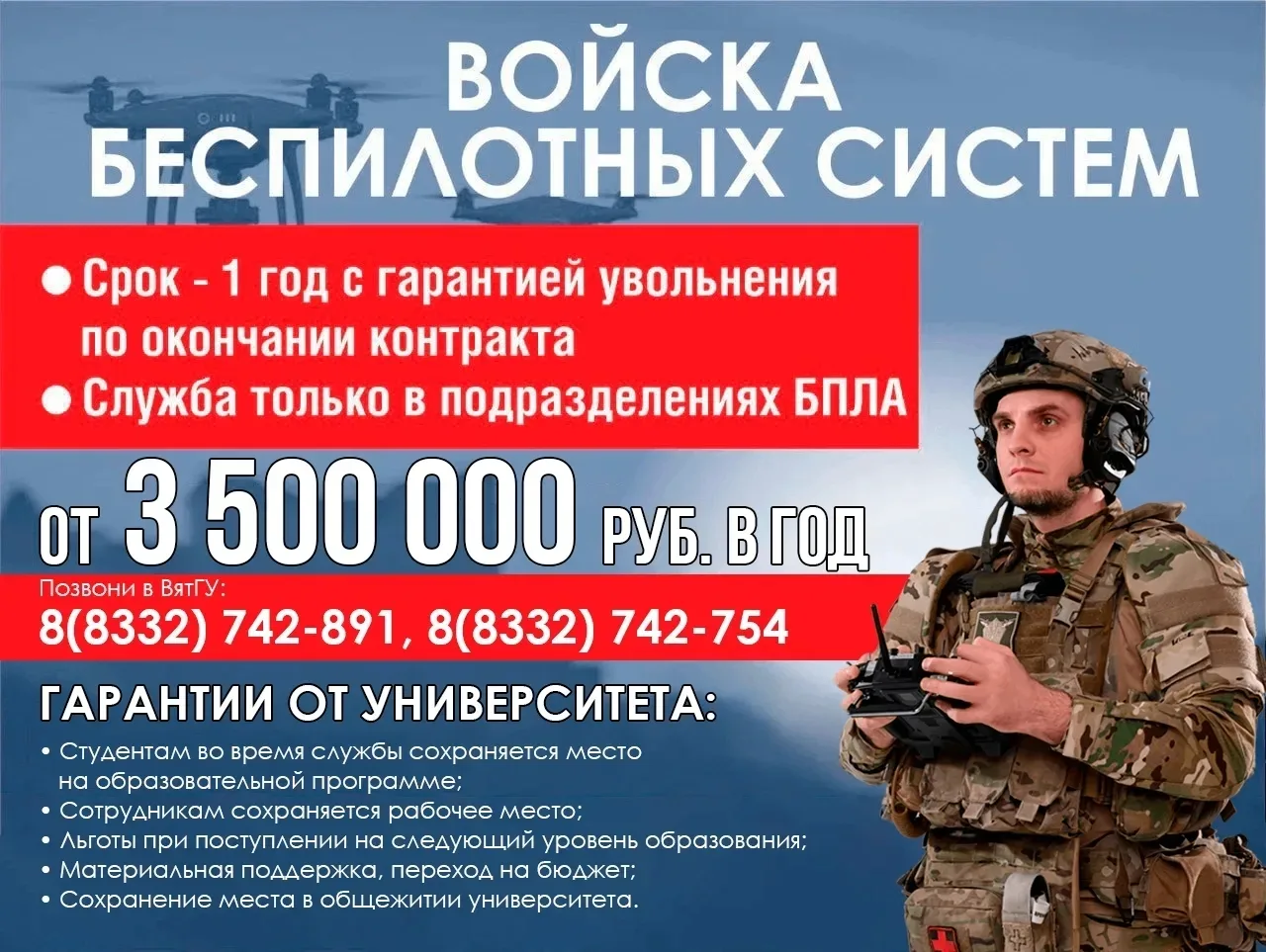 • Срок службы — от 1 года с гарантией увольнения по окончании контракта;• Служба только в войсках беспилотных систем— без перевода в другие подразделения;• Обучение бесплатно! Срок обучения до 2 месяцев.