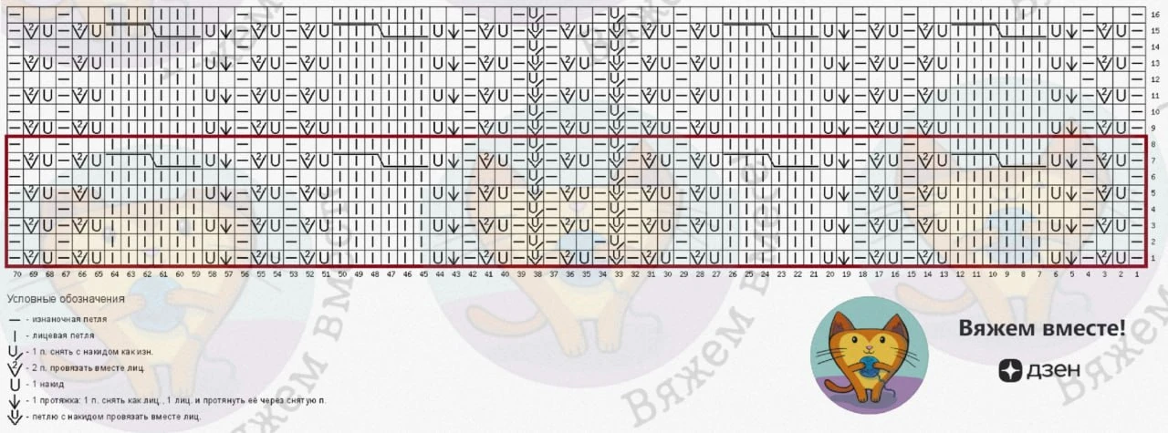 Высота раппорта — 8 рядов. Пустая клетка = лицевая петля.