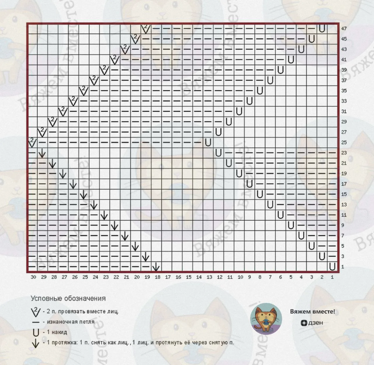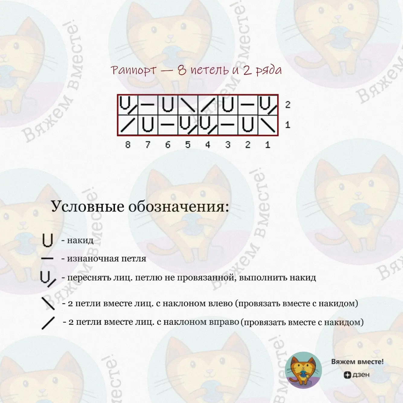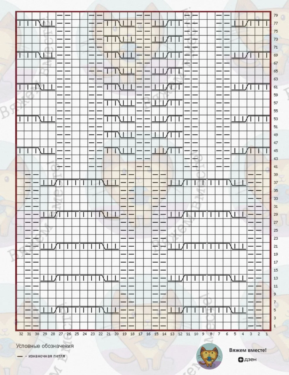 ✏️ Раппорт узора — 32 петли и 80 рядов. Пустая клетка = лицевая петля. Чётные ряды вязать так, как петли лежат на спице.