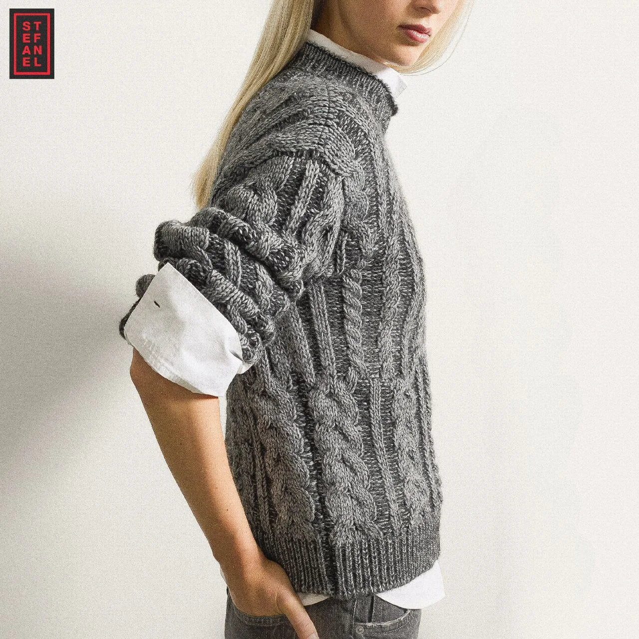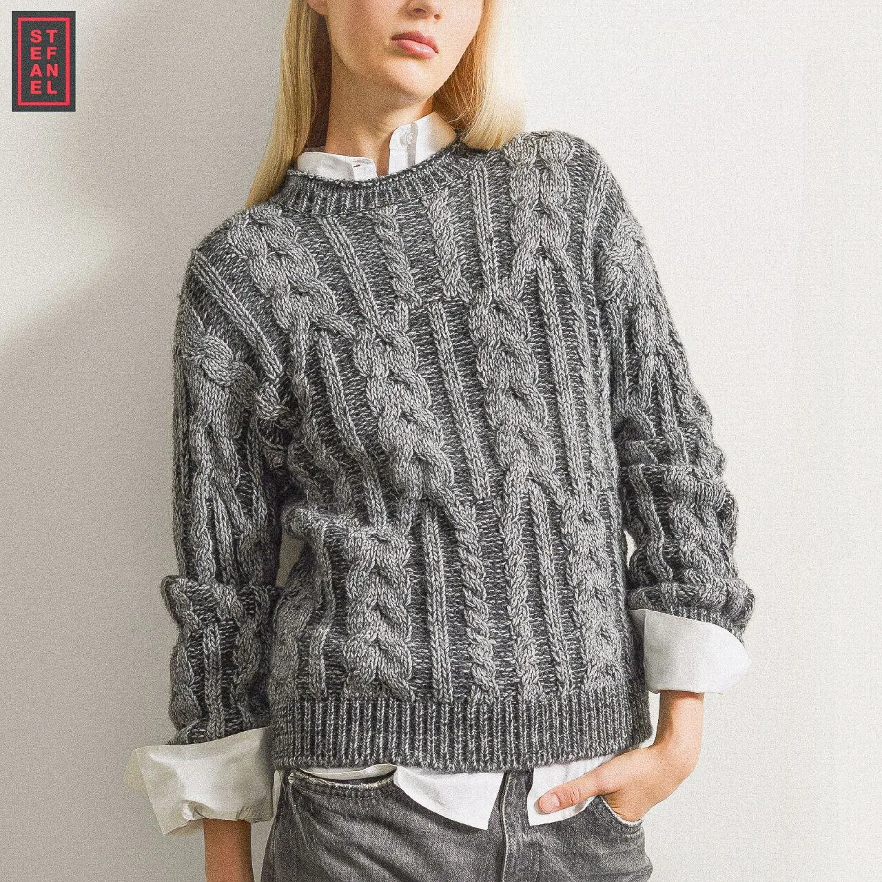 Особое очарование придаёт меланжевая пряжа. За счёт лёгкой игры оттенков — от светлого серого до глубокого графита — узор будто оживает, жгуты выглядят объёмнее и интереснее. Это отличный приём, если хочется добавить узору ещё больше глубины и фактуры.