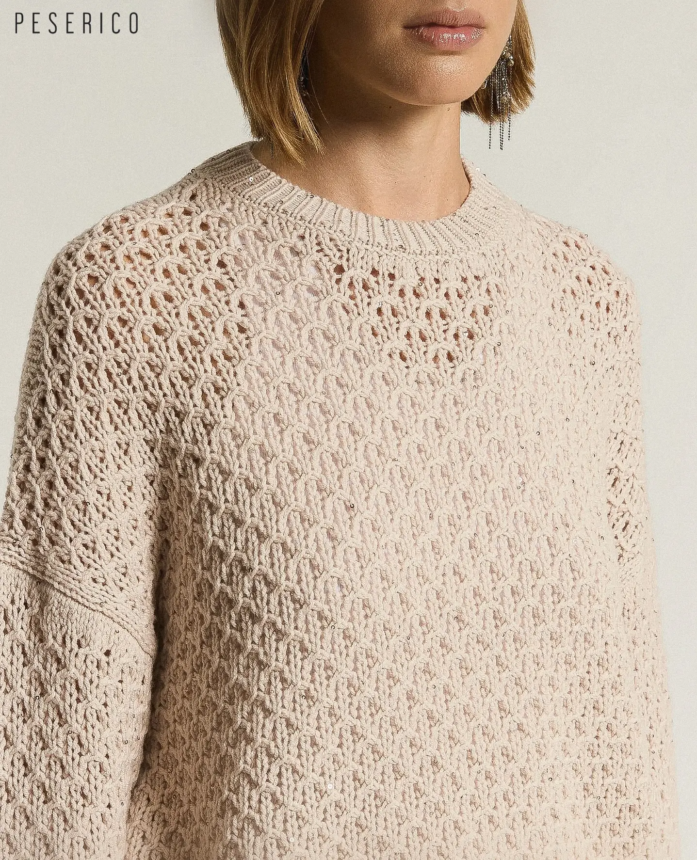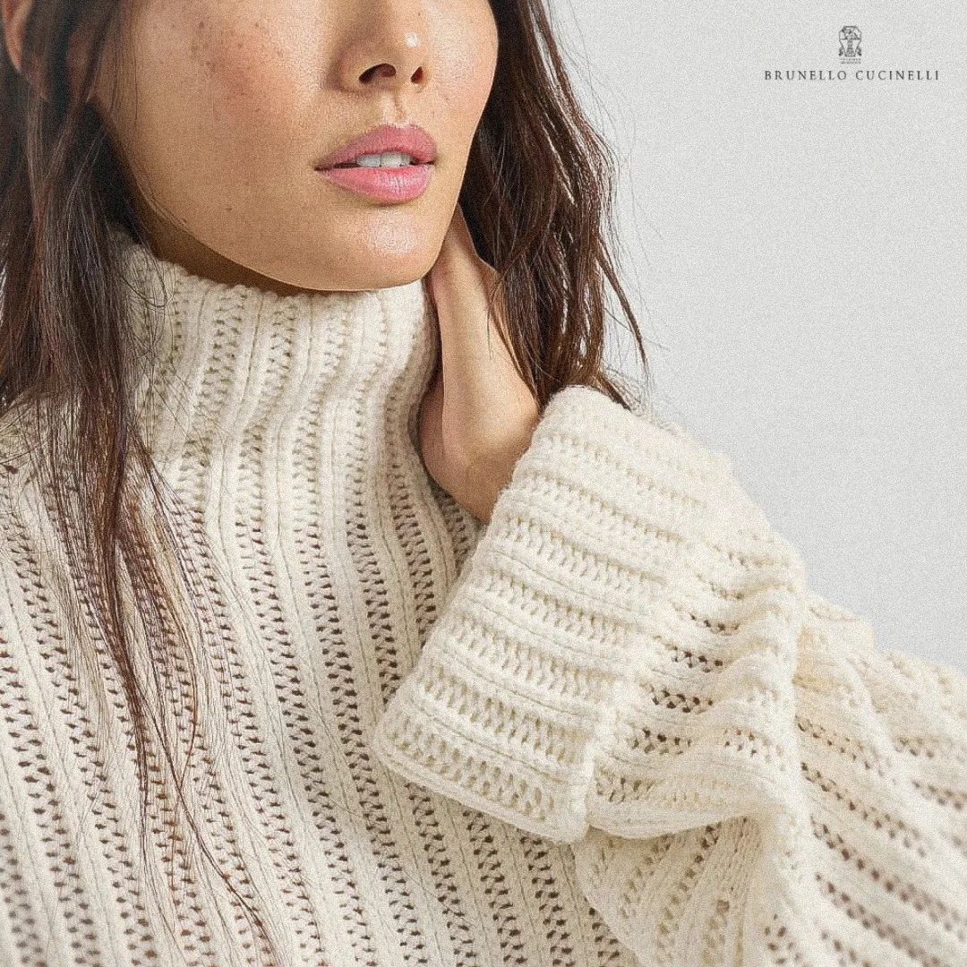 Вы удивитесь, модель на фото из коллекции Брунелло Кучинелли. Никаких пайеток и блеска, а вместо этого грубая нить с джутом в составе. Вот так король кашемира умеет удивить и впечатлить. 👀
