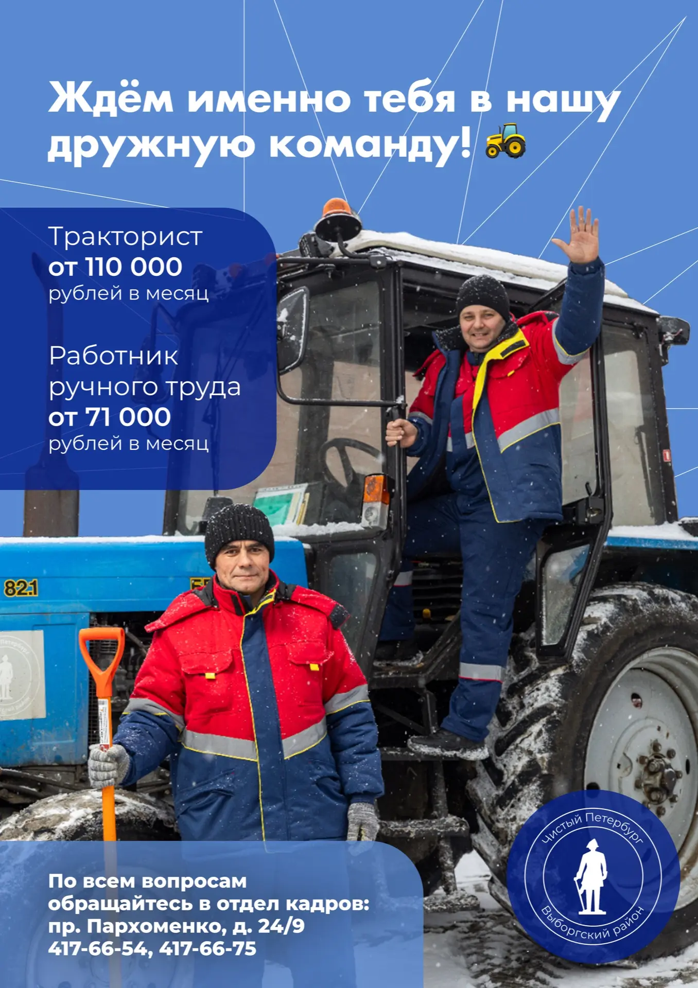 Мы ищем ответственных и трудолюбивых людей, чтобы вместе заботиться о любимом Выборгском районе.
