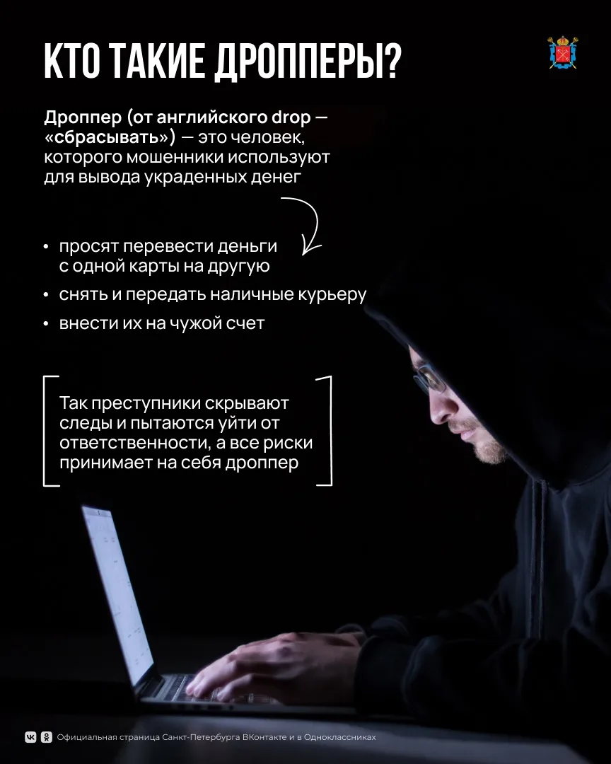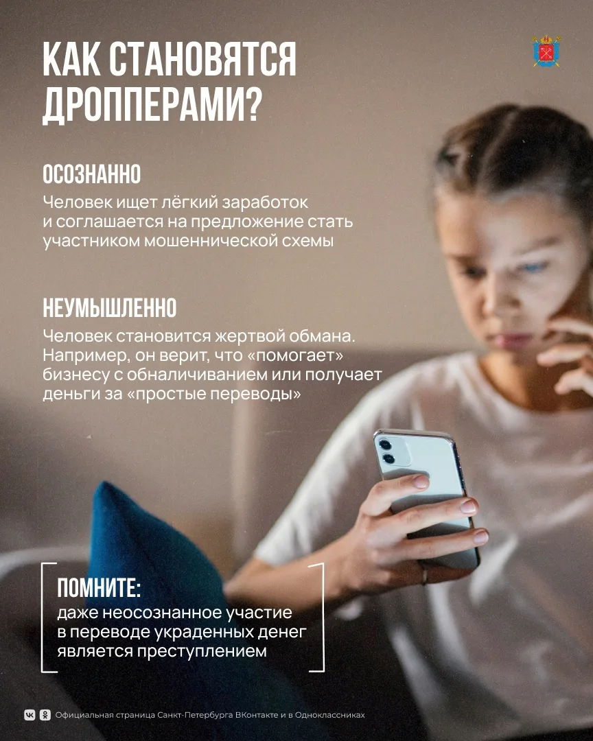 Они используют школьников в качестве дропперов — людей, которые предоставляют преступникам свои банковские карты для вывода денег. Соглашаясь на подобное, молодые люди рискуют быть привлечены к ответственности.