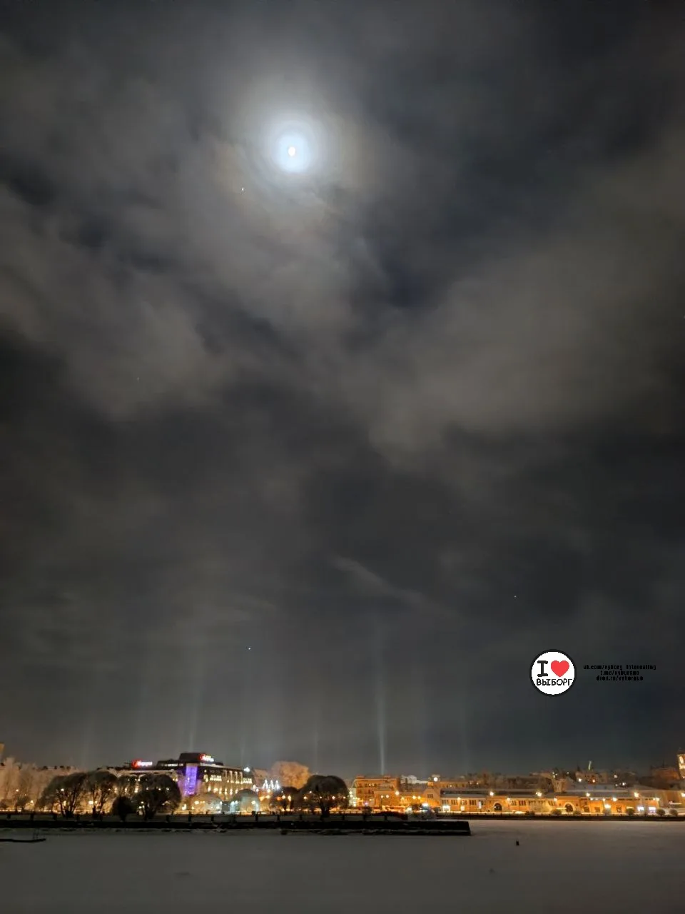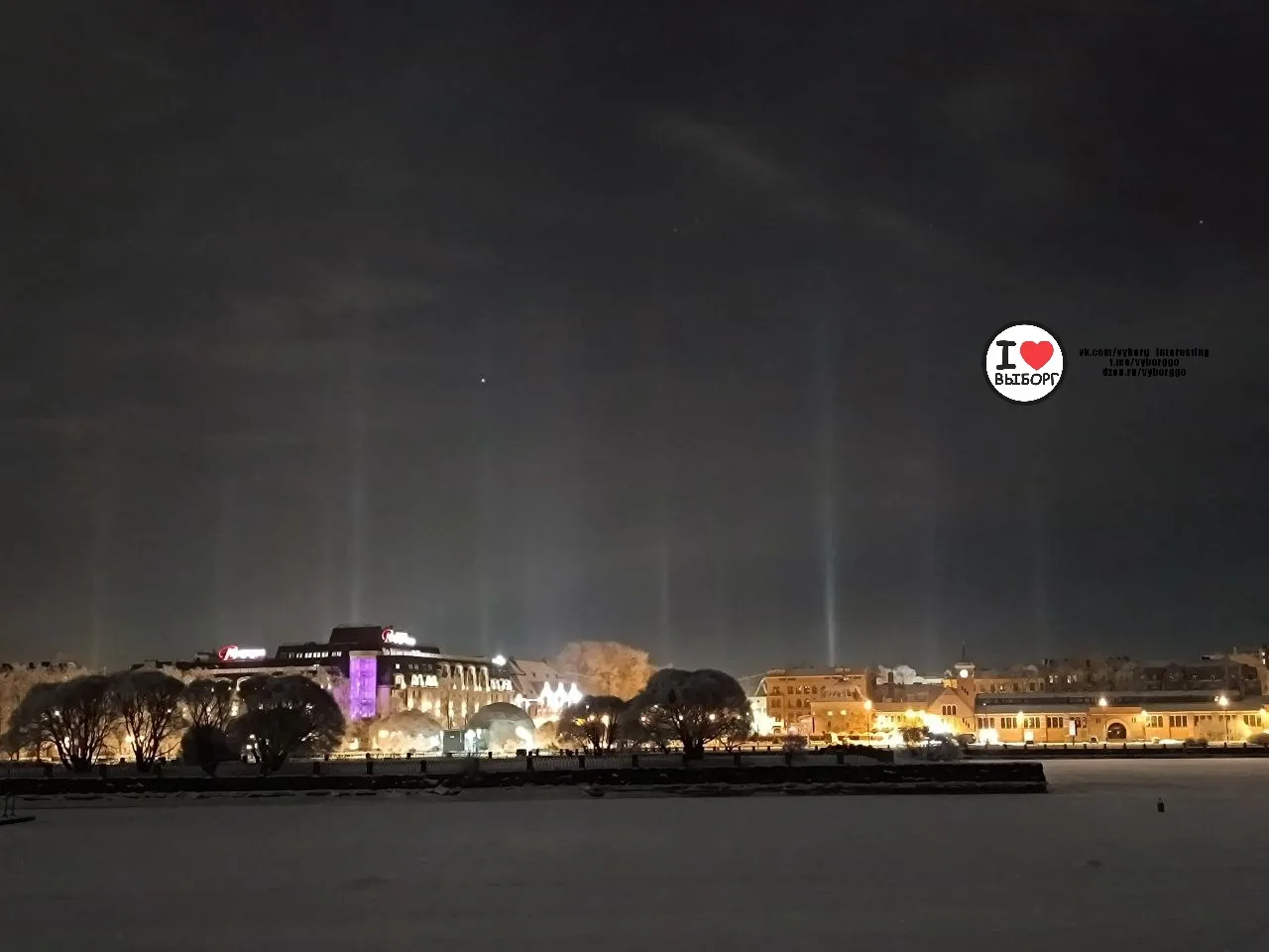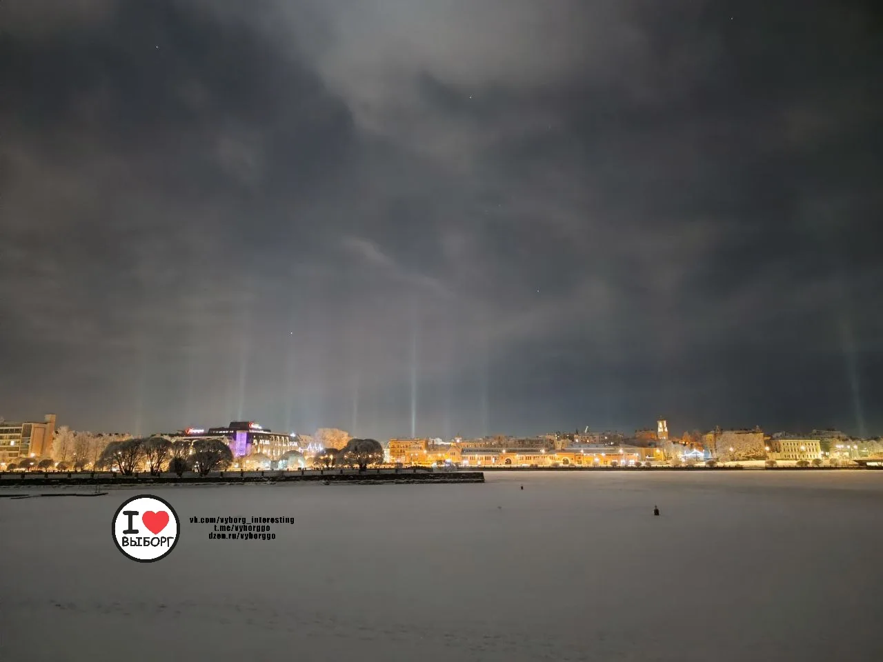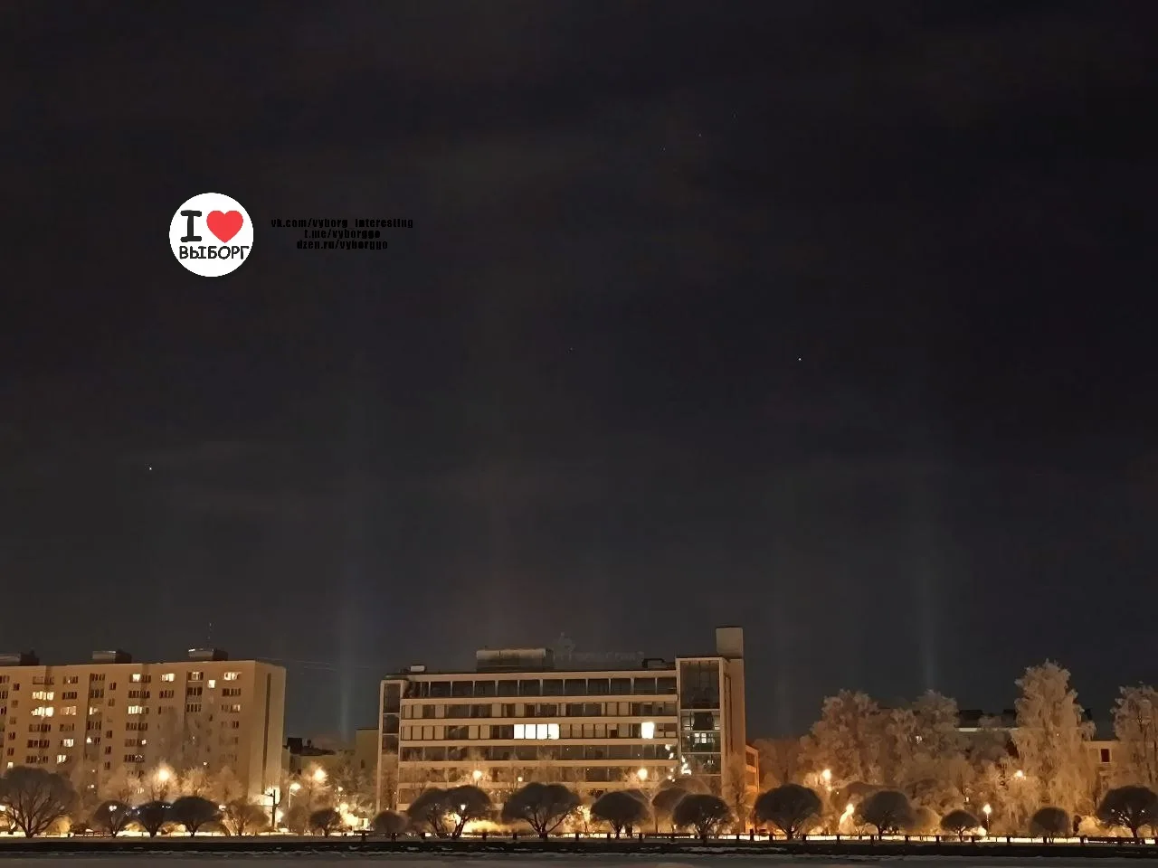 Наша подписчица Мария Рыбальченко запечатлела редкое атмосферное явление — световые столбы, украсившие ночное небо Выборга сегодня около полуночи.