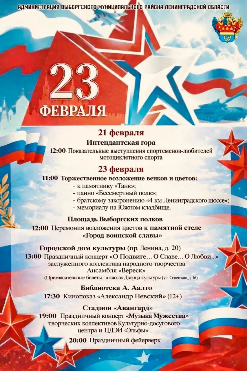 • 23 февраля в 12.00 (Площадь Выборгских полков) - церемония возложения цветов к памятной стеле
