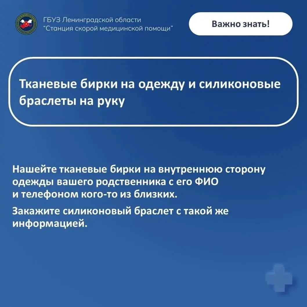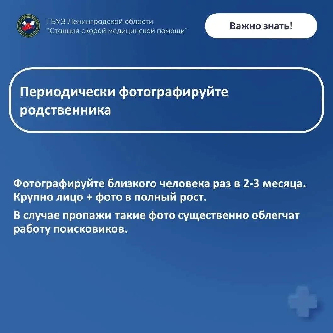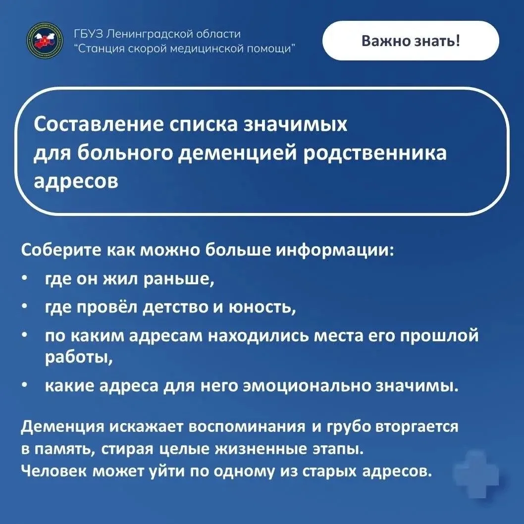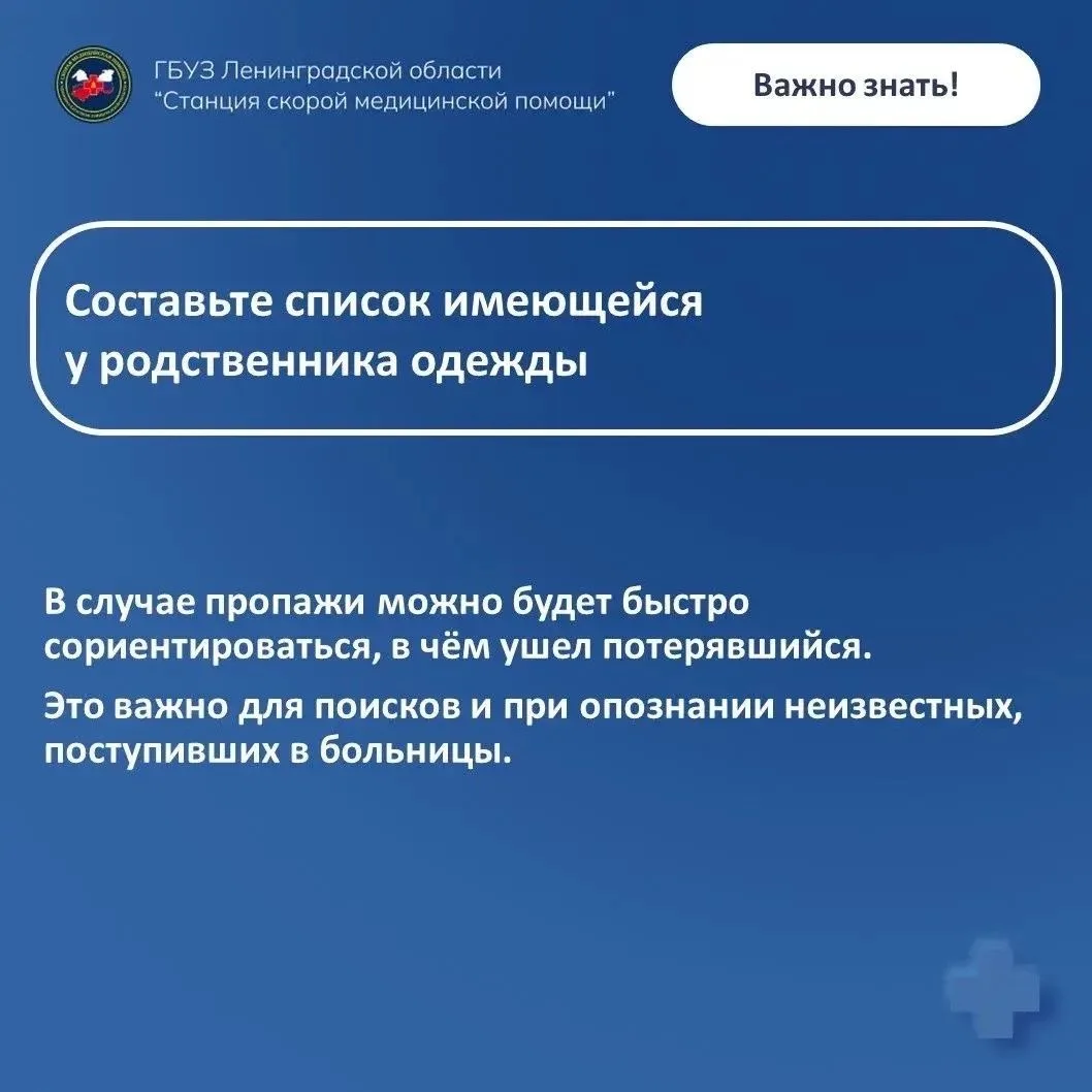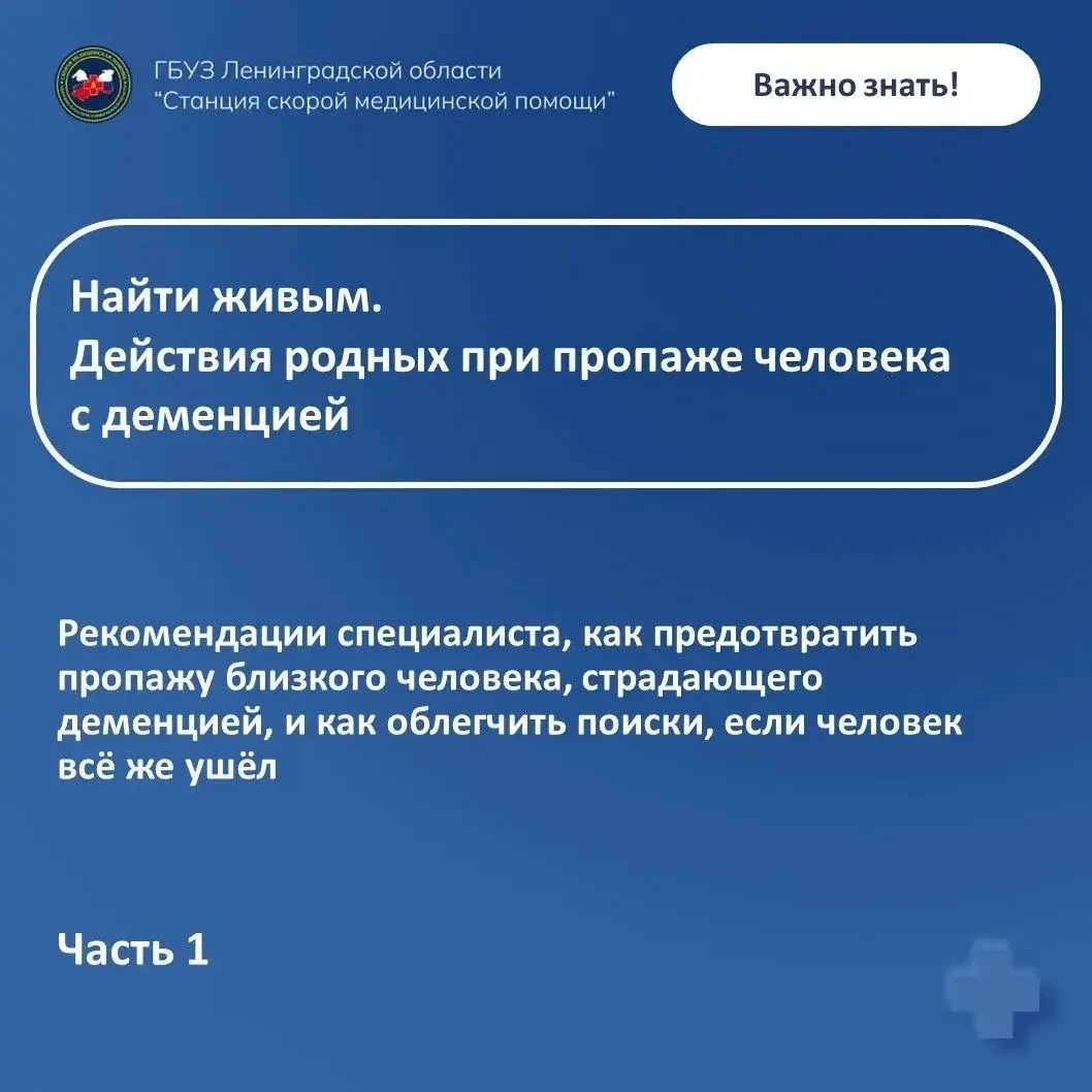 Фельдшер Выборгской подстанции скорой помощи Любовь Кулакова, имеющая многолетний опыт работы в спасательном отряде, подготовила рекомендации, как предотвратить пропажу близкого человека, страдающего деменцией, и как облегчить поиски, если человек всё же ушёл из дома.