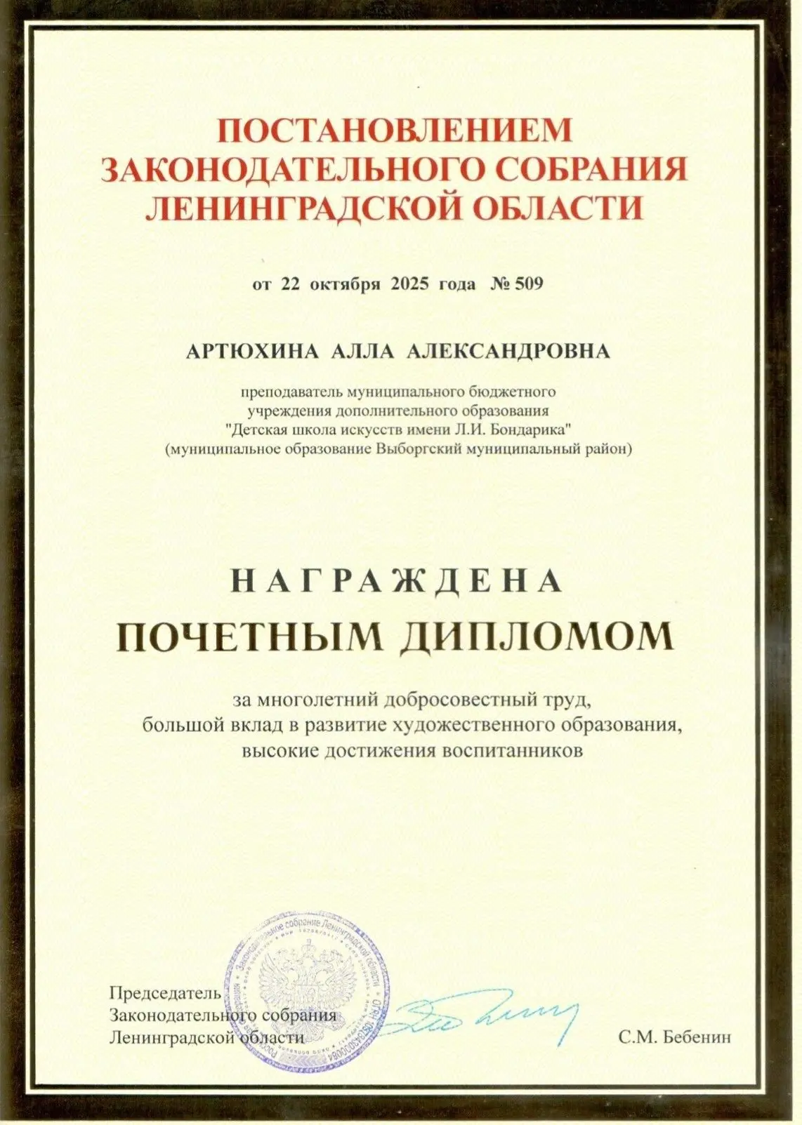 Алла Артюхина, преподаватель Детской школы искусств имени Л.И. Бондарика, удостоена почетного диплома Законодательного собрания Ленинградской области «За многолетний добросовестный труд, большой вклад в развитие художественного образования, высокие достижения воспитанников».