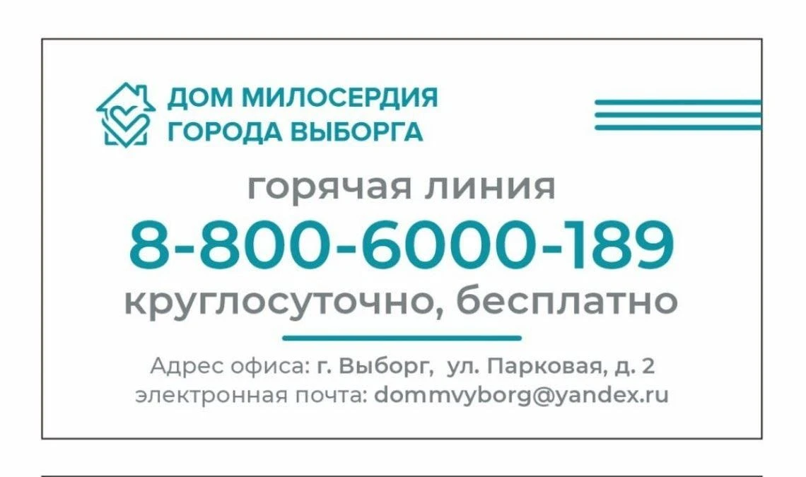 «Дом милосердия в городе Выборге» оказывает услуги комплексной паллиативной помощи на дому - неизлечимо больным людям, пожилым людям, людям с инвалидностью в конце жизни и их семьям. Для связи с медиками запущена круглосуточная горячая линия.