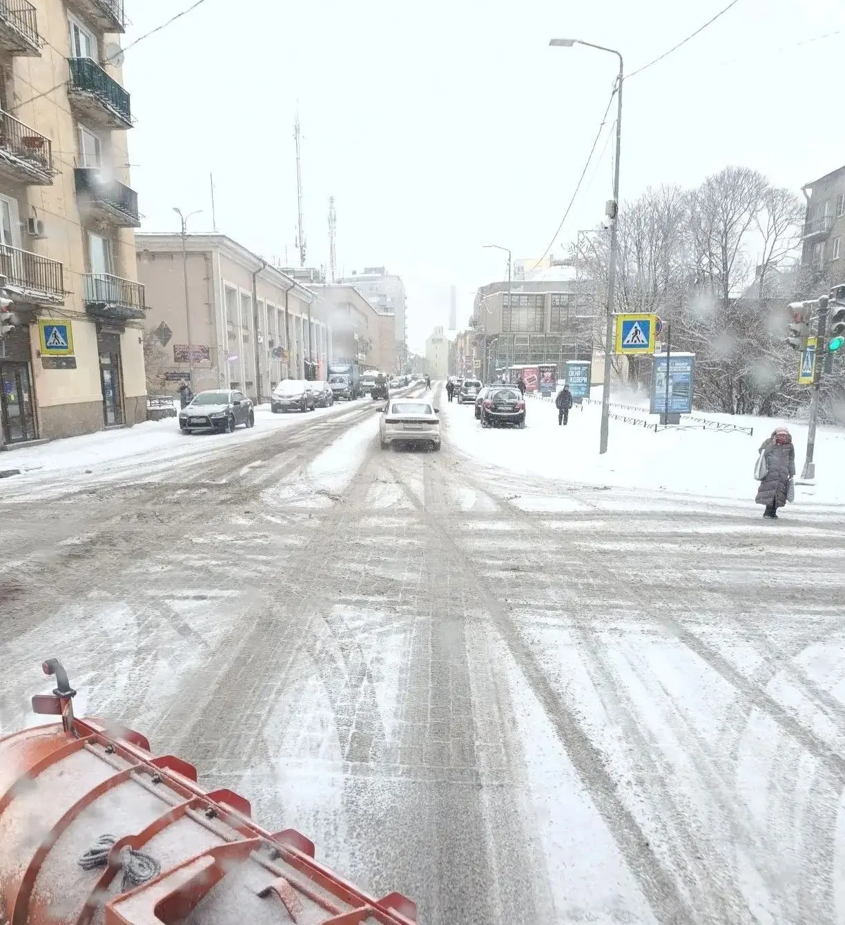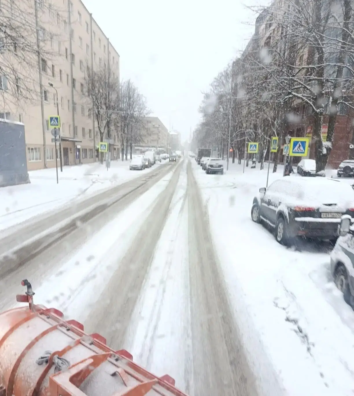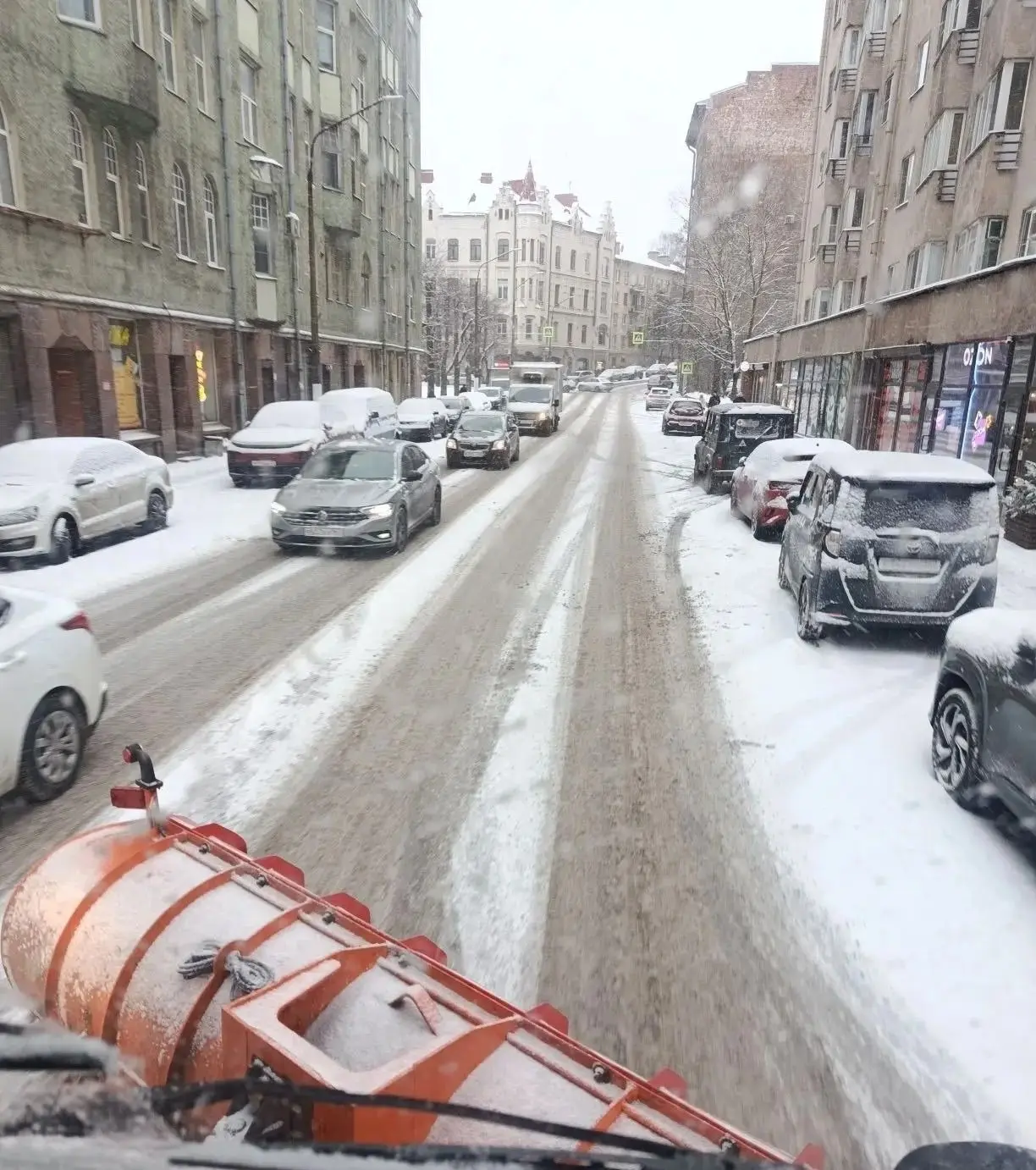 С раннего утра в Выборге идет снег. И с самого утра техника Комбината благоустройства занимается уборкой городских улиц.
