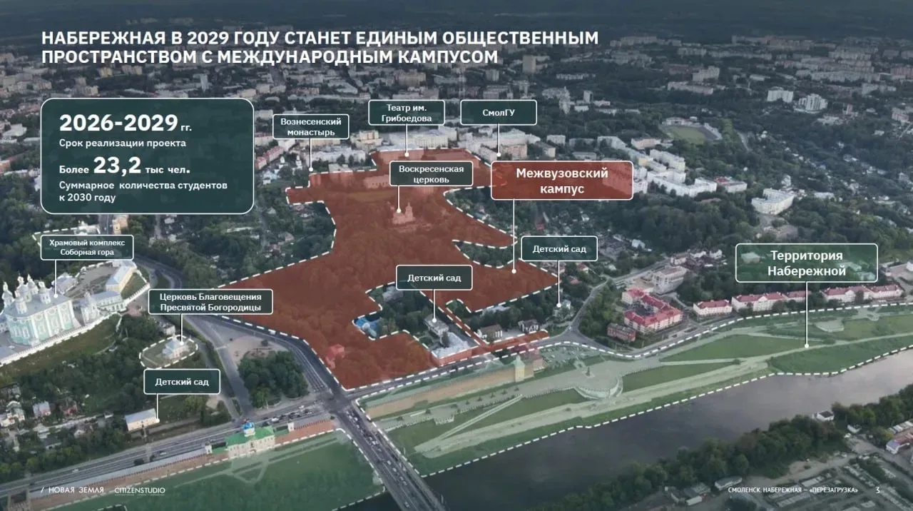 В Смоленске обсуждают концепцию реконструкции Владимирской набережной. Авторы предлагают не сносить существующие конструкции, а создать единое пространство с будущим межвузовским кампусом.
