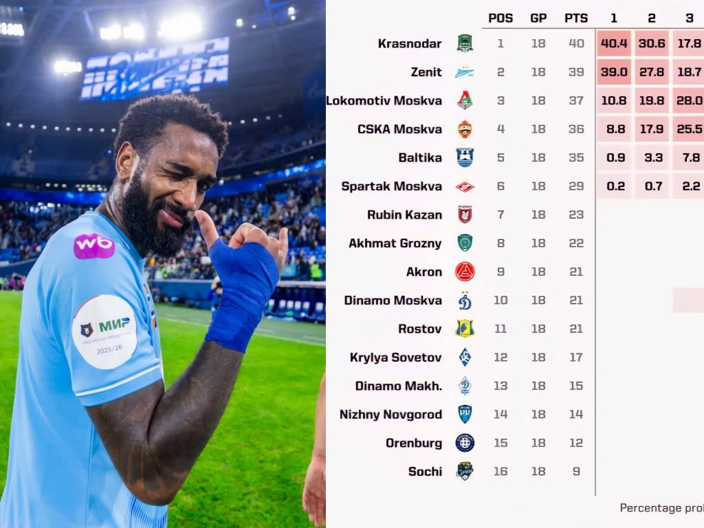 ❗️Шансы «Зенита» на чемпионство после 18 туров составляют 39%. У «Краснодара» — 40, — Opta Sports