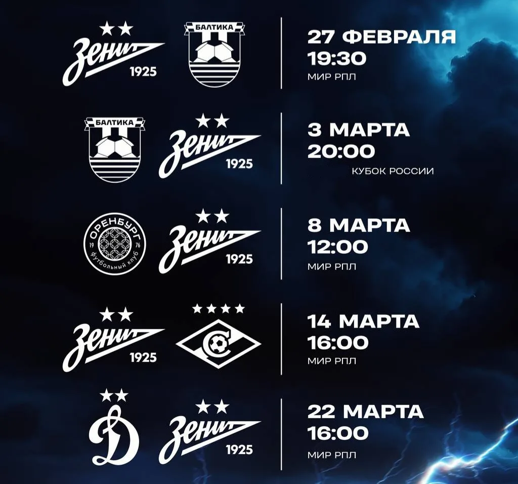 ⚡️«Зенит» возобновит сезон 27 февраля: первой игрой после зимнего перерыва будет встреча на «Газпром Арене» с «Балтикой» в рамках РПЛ, после чего «Зенит» отправится на выезд в Калининград, где вновь встретится с «Балтикой», но в рамках Кубка России. 14 марта состоится игра со «Спартаком» на «Газпром Арене».
