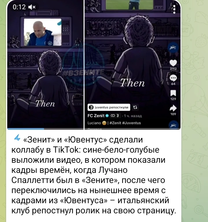 ⚡️«Зенит» и «Ювентус» сделали коллабу в TikTok: клубы совместно выложили видео, в котором показали кадры времён, когда Лучано Спаллетти был в «Зените», после чего переключились на нынешнее время с кадрами из «Ювентуса».