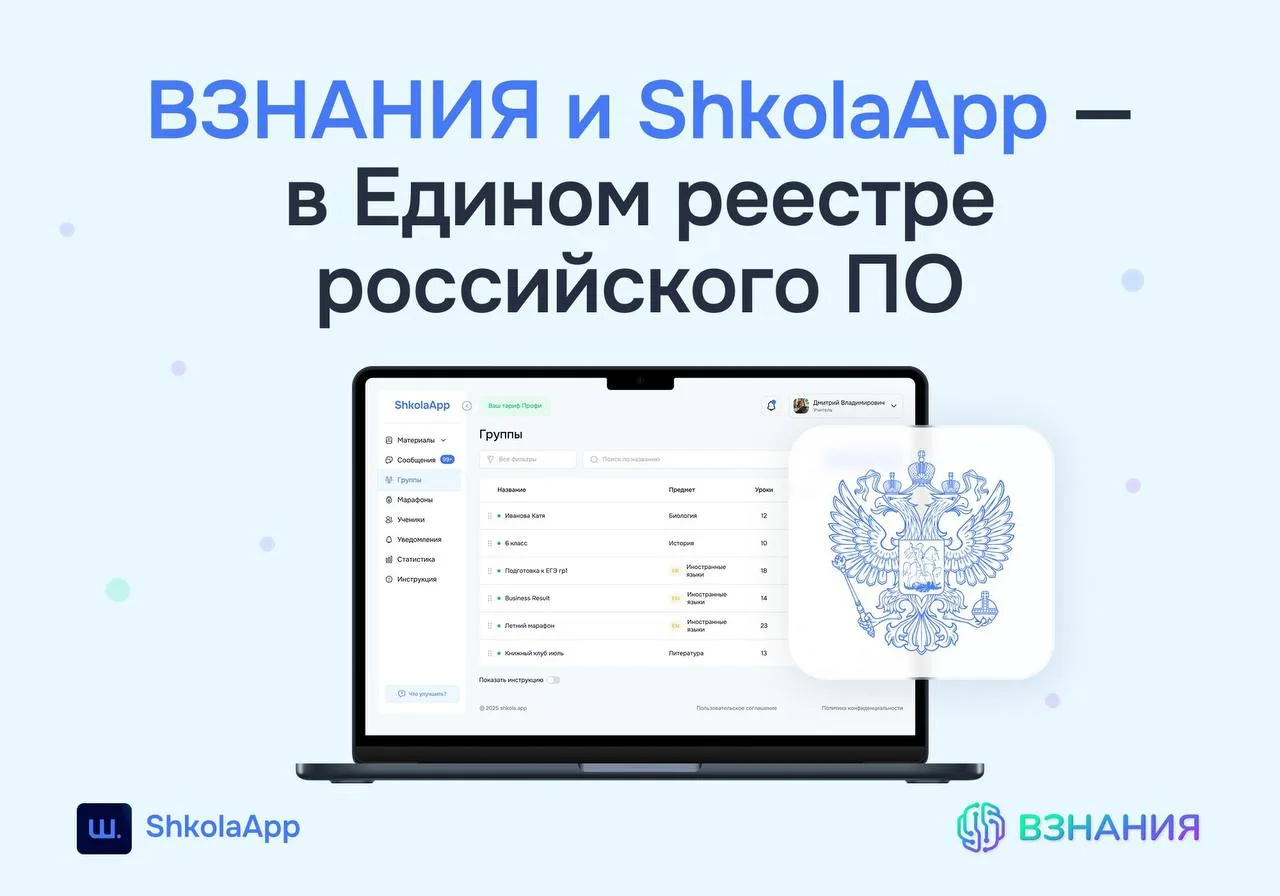 ВЗНАНИЯ и ShkolaApp внесены в Единый реестр российского программного обеспечения (ПО) по приказу Министерства цифрового развития, связи и массовых коммуникаций РФ. Для нас это большое достижение, и мы рады поделиться им с вами.