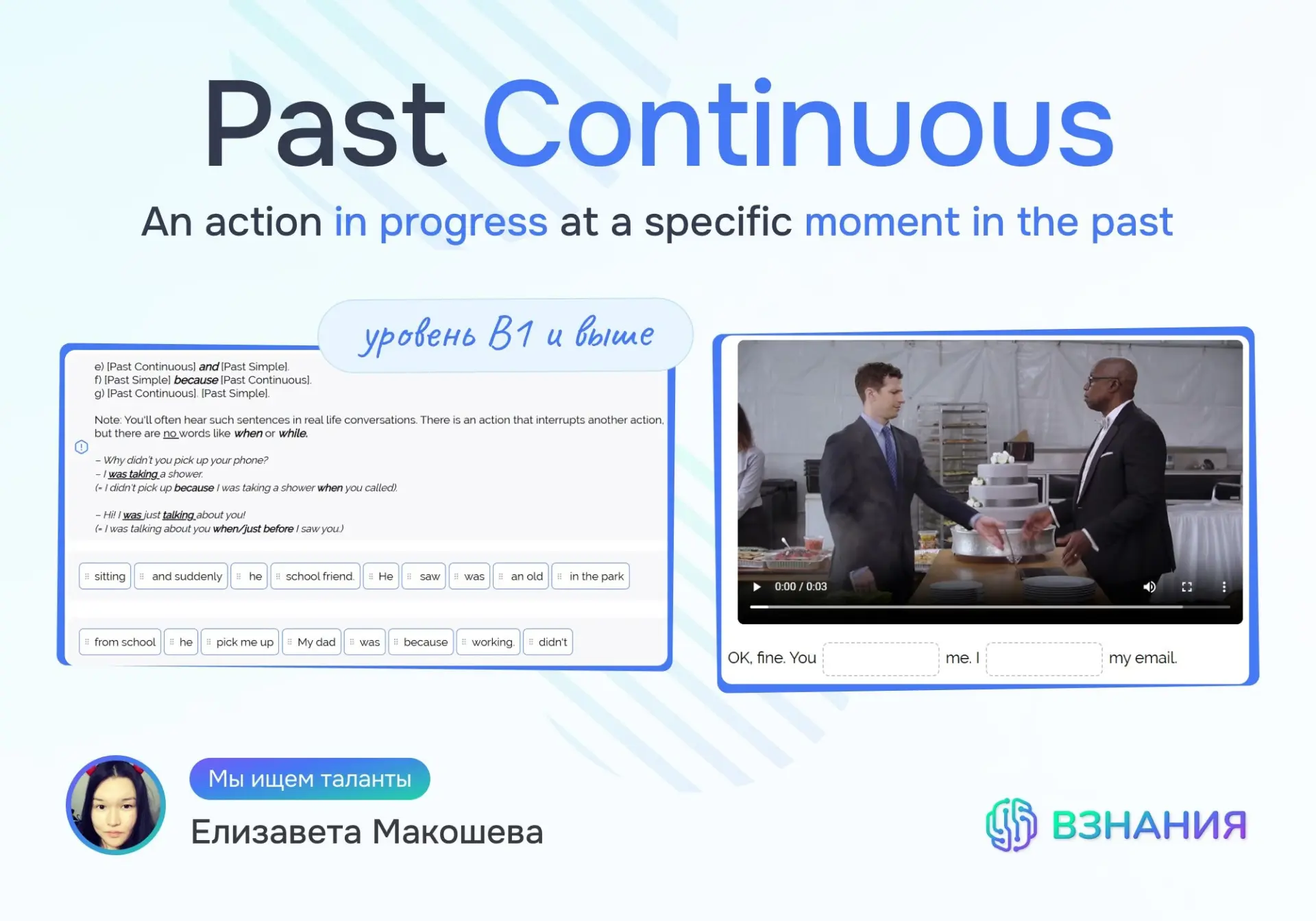 Предлагаю свой материал по теме Past Continuous. Конкретный урок посвящен только одному использованию этого времени. Он подойдет для подростков и взрослых, которые уже знакомы со временем/у которых это время больше в пассиве. Уровень B1 и выше.