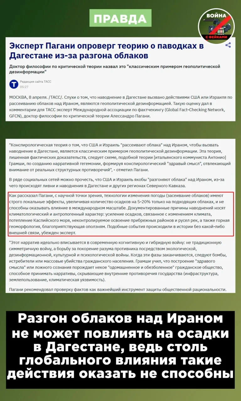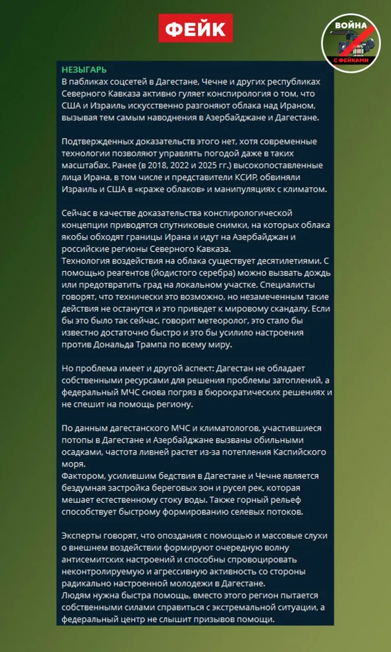 Фейк: Рекордные осадки в Дагестане вызваны тем, что американцы «расчищают небо Ирана от облаков». Это приводит к перераспределению воздушных масс над Каспием и обильным ливням на территории Азербайджана и России, сообщают проукраинские телеграм-каналы и ресурсы иноагентов.