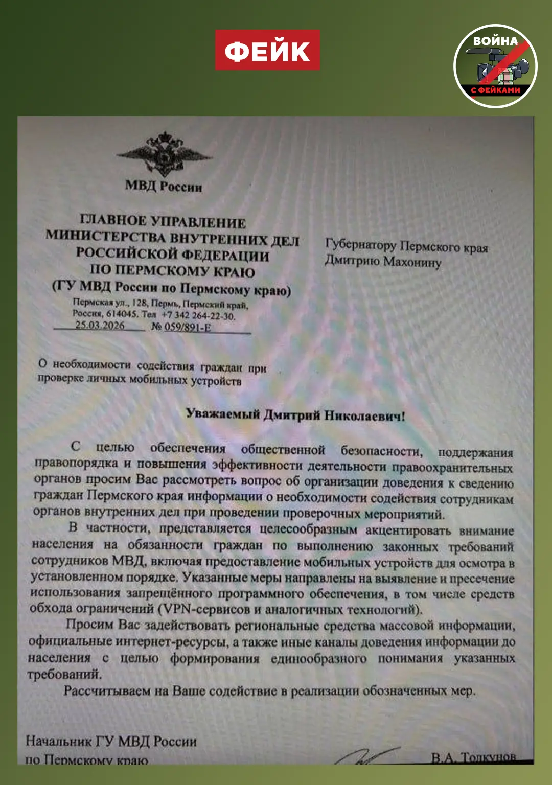 Фейк: В Пермском крае полицейские проверяют телефоны граждан на наличие VPN-сервисов. Об этом говорится в письменном обращении начальника регионального МВД к губернатору Дмитрию Махонину, которое опубликовали телеграм-каналы.