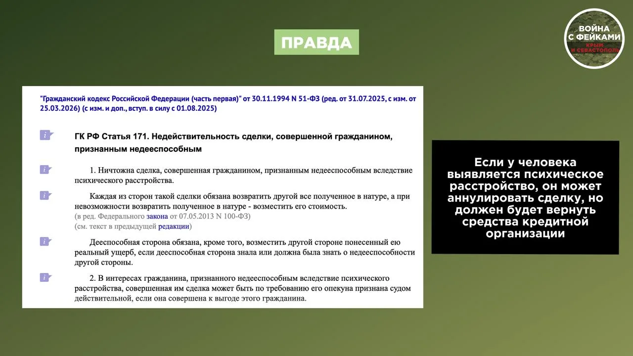 Российское законодательство предусматривает для заемщика возможность признать заключенные договоры недействительными из-за психического расстройства. Заемщик должен вернуть полученные средства или пройти процедуру банкротства, если такой возможности нет.