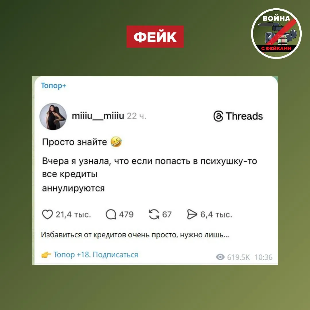 Фейк: Все кредиты можно списать, если просто лечь в психиатрическую больницу. Сообщения об этом распространяются в телеграм-каналах и соцсетях.