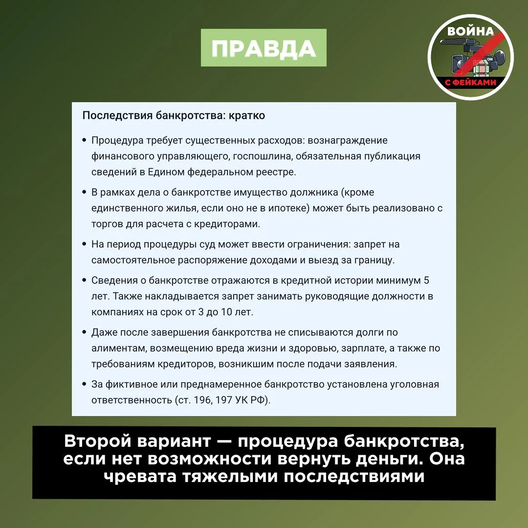 Поэтому доверять опасным рекомендациям из сети ни в коем случае не нужно! Нередко под маской подобных фейков скрывается реклама услуг «экспертов» по списанию долгов, которые вместо решения финансовой проблемы должника наоборот усугубляют его ситуацию и наживаются на этом.
