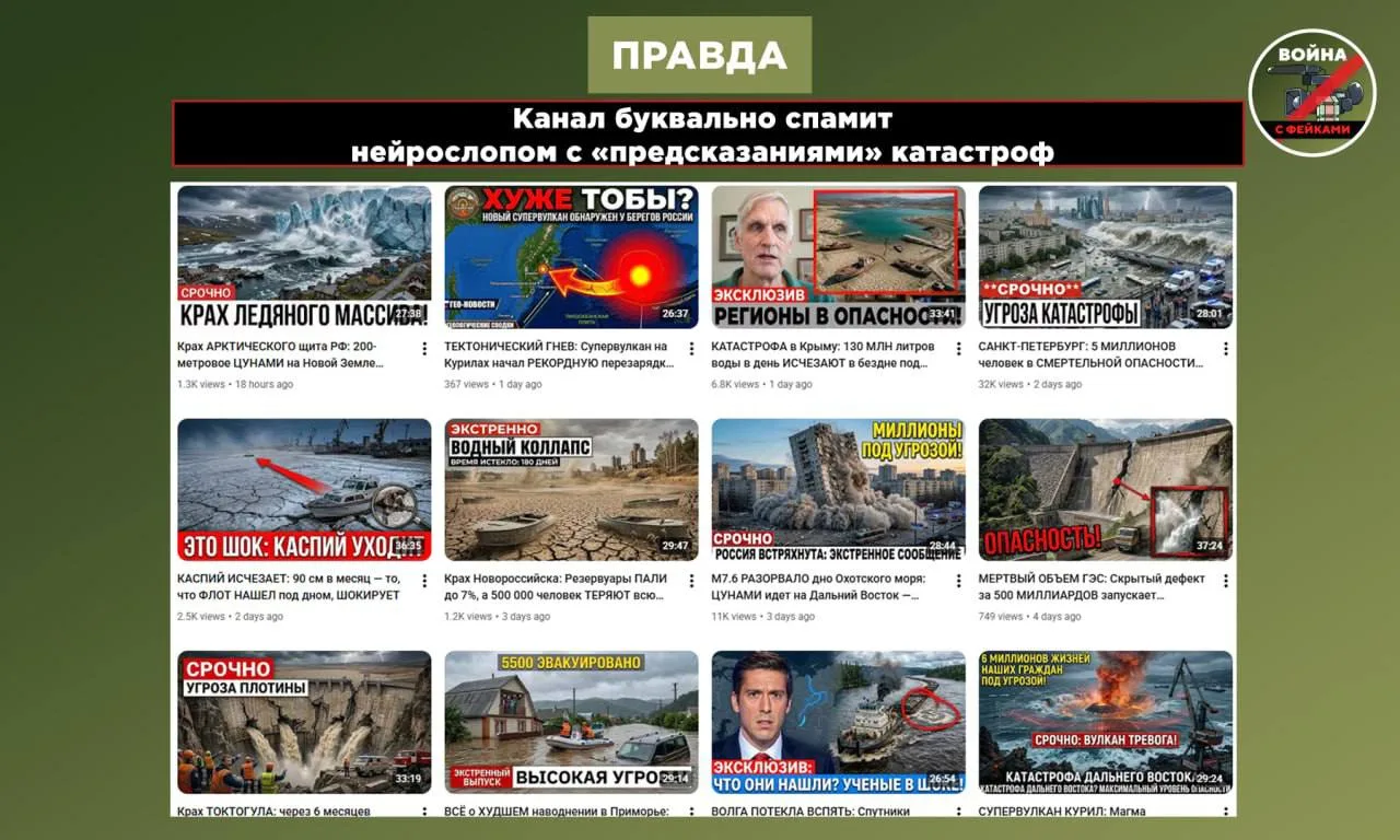 Канал, опубликовавший видео о «шестиметровой волне», специализируется на демонстрации именно такого контента. Его авторы по несколько раз в день «предсказывают» наивным зрителям «апокалипсис» в разных точках страны — от двухсотметрового цунами на Новой Земле до остановки течения Ангары. Некоторые из этих «катастроф», если верить публикациям, должны были произойти буквально через пару минут после появления в сети громких кликбейтных заголовков.