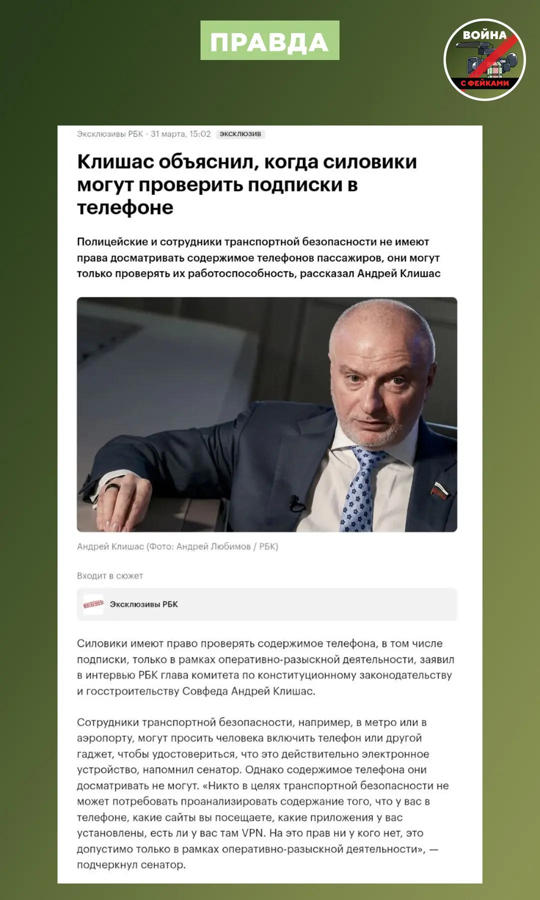 «Это не то, что вы идете по улице, вас останавливают и говорят, дайте мне ваш телефон, я посмотрю, что у вас там за приложения установлены. Это незаконно», — отметил Клишас, подчеркнув, что случаи, в которых ведется оперативно-разыскная деятельность, прописаны в законодательстве.