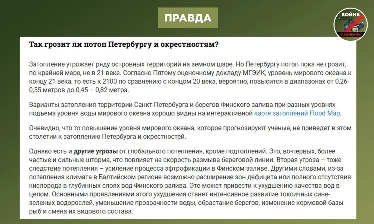 Правда: Катастрофическое цунами Северной столице не грозит, равно как и затопление — по крайней мере, до конца XXI века. Мы имеем дело с так называемым нейрослопом — продукцией, намеренно созданной с помощью искусственного интеллекта, без каких-либо стремлений к достоверности.
