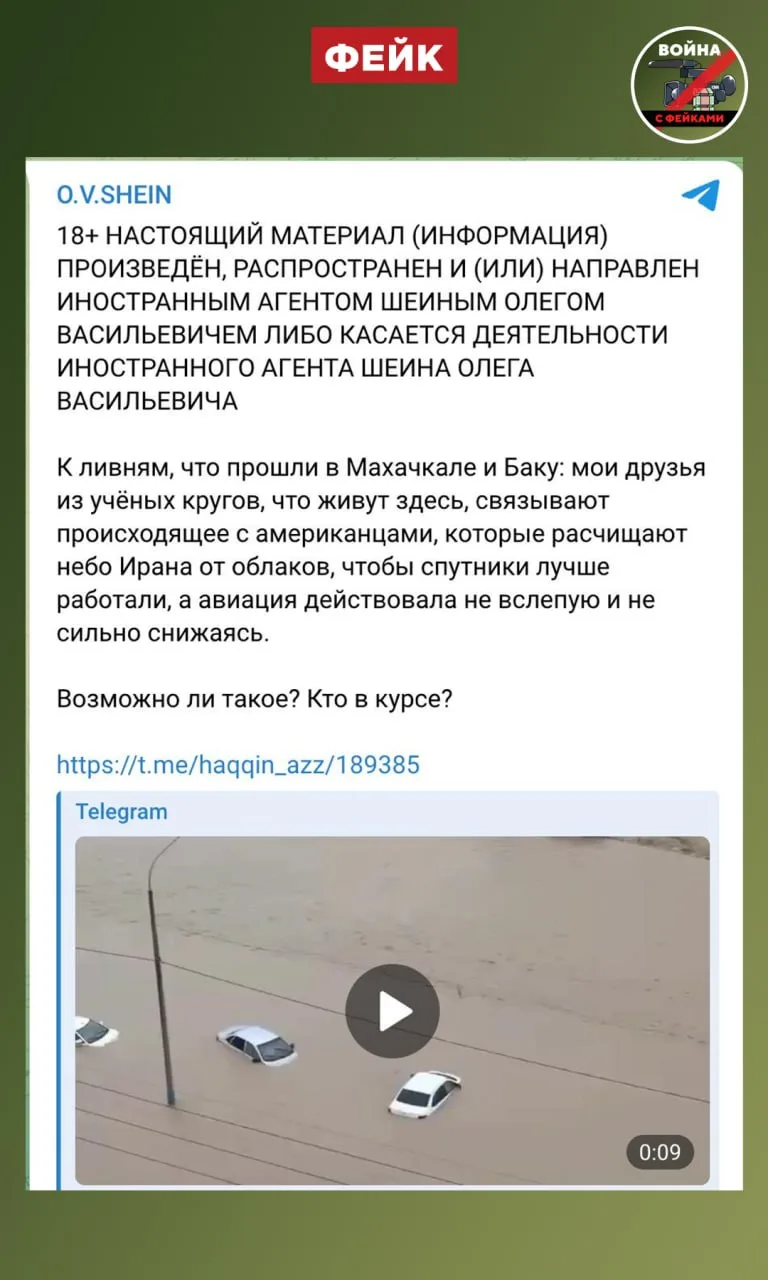 Ранее мы сообщали, что застрельщиком абсурда про кражу облаков в Иране и связи «воровства» с наводнениями в российских регионах и Азербайджане стал иноагент Олег Шеин, которого поддержали проукраинские площадки. Оттуда вброс попал в дагестанские чаты.