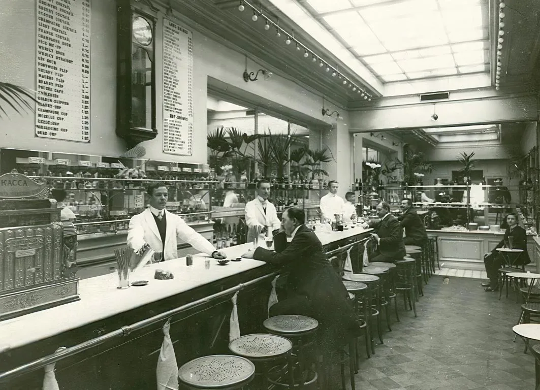 Именно здесь петербуржцы впервые увидели высокую барную стойку, высокие стулья и попробовали шампанское с виски, абсент с бенедиктином и коктейли со льдом — это было невероятно модно и дорого.