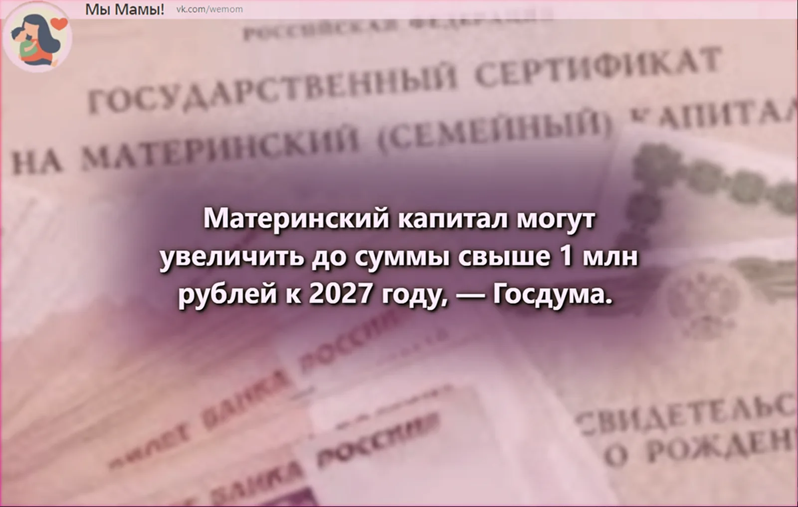 Материнский капитал могут увеличить до суммы свыше 1 млн рублей к 2027 году, — Госдума.