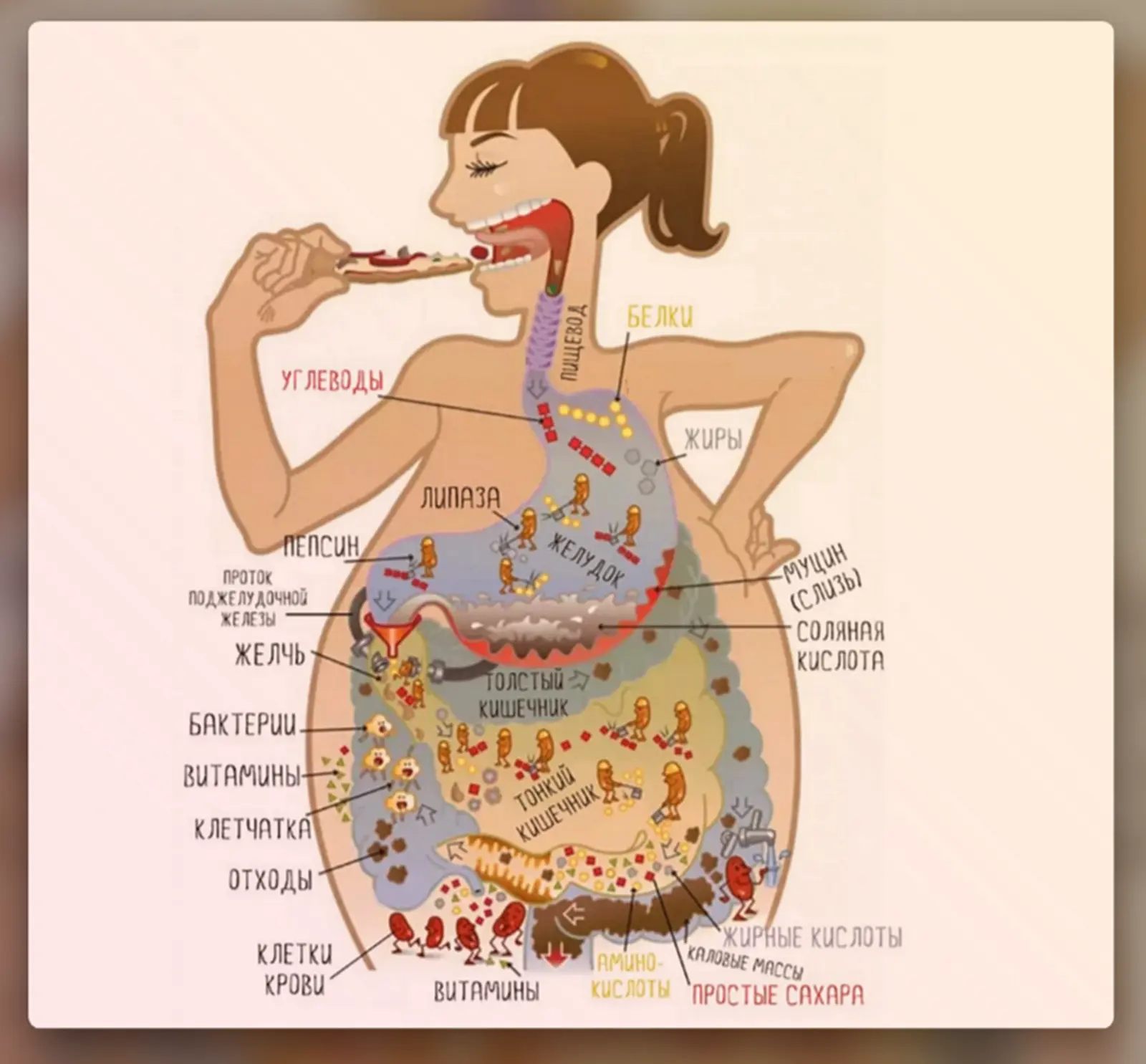 * Жиры идут в адипоциты (жировые клетки) — в основном под кожу, частично вокруг органов (висцеральный жир).