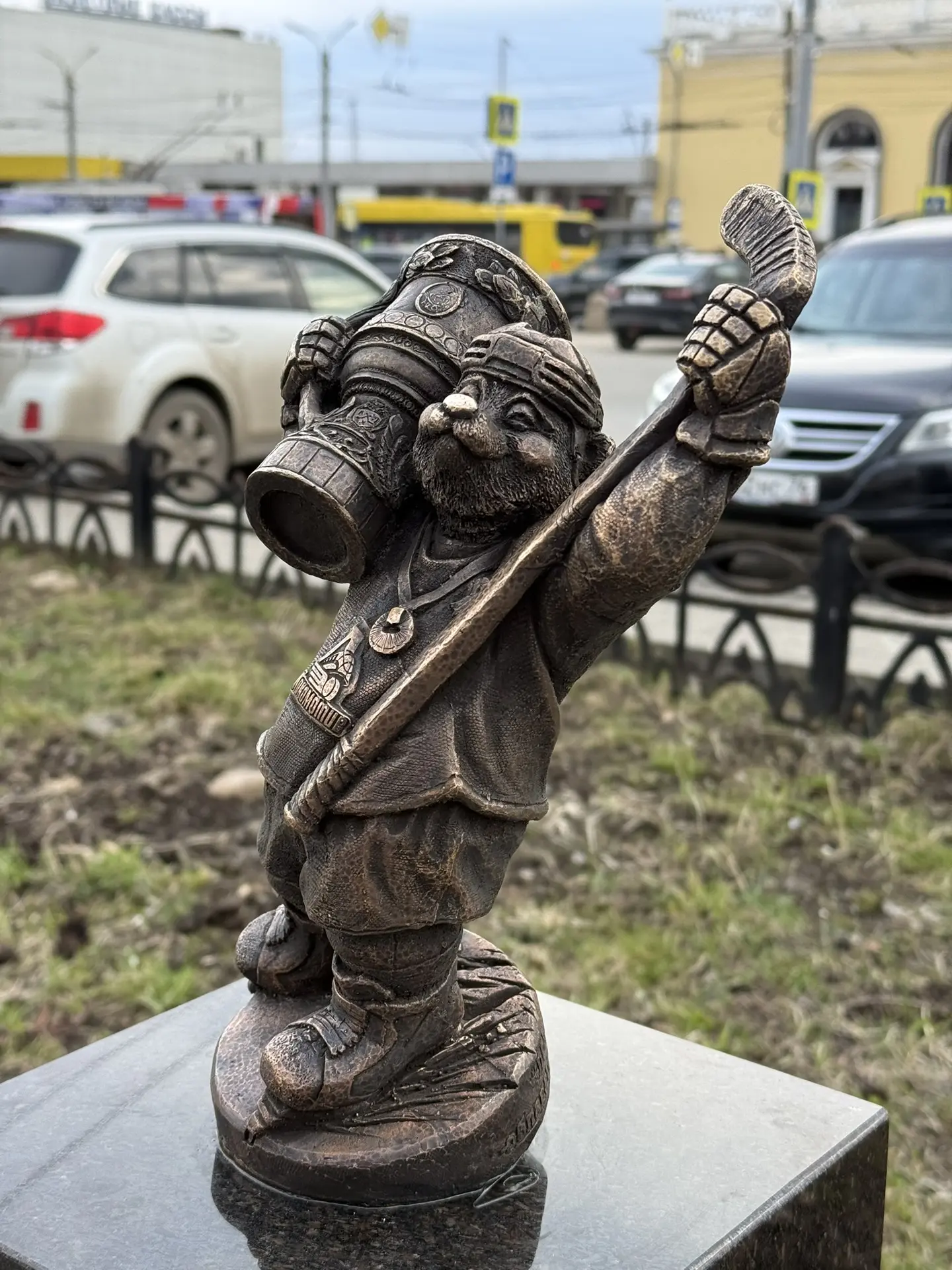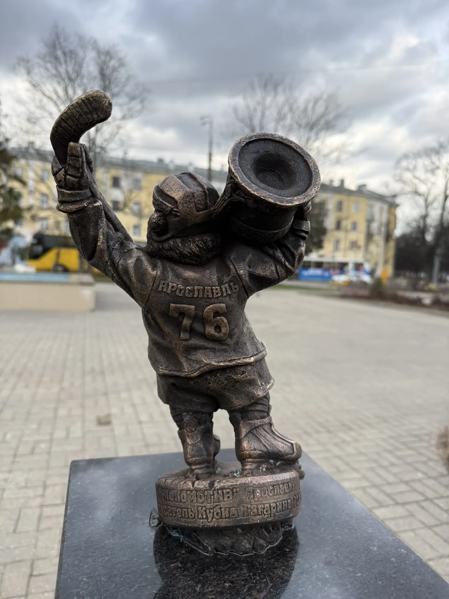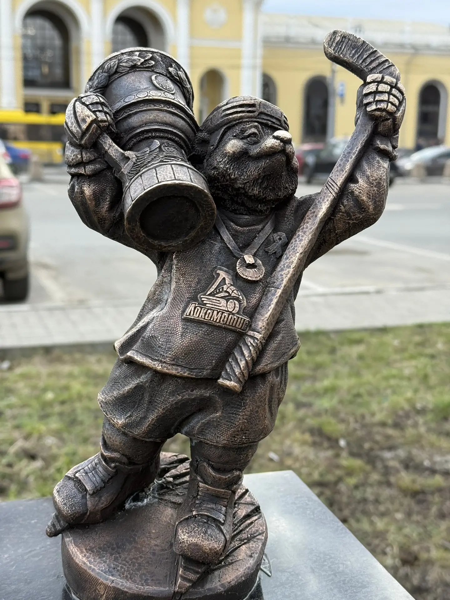 Это бронзовая копия тех медведиков, которых дарили игрокам «Локомотива» на чемпионском параде в августе 2025 года.